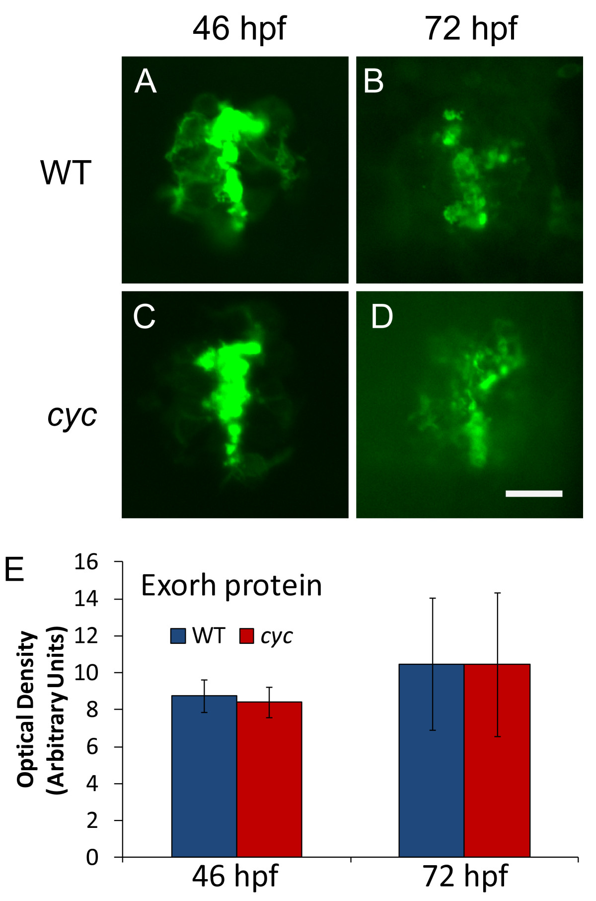 Fig. 3 Pineal Exorh protein expression is indistinguishable between cyc mutant and WT embryos. Embryos were fixed and processed for whole mount antibody staining with the anti-Rhodopsin antibody 4D2. Quantification of fluorescent antibody signal shows that optical density of the pineal immunostaining is not significantly different at either time point (46 hpf, ZT 22, n = 10 embryos, p = 0.41; 72 hpf, ZT 0, n = 10 larvae, p = 0.67). Images are dorsal views with anterior to the top. Experiment was repeated two times with similar results, and representative embryos are shown. Scale bar = 20 μm.