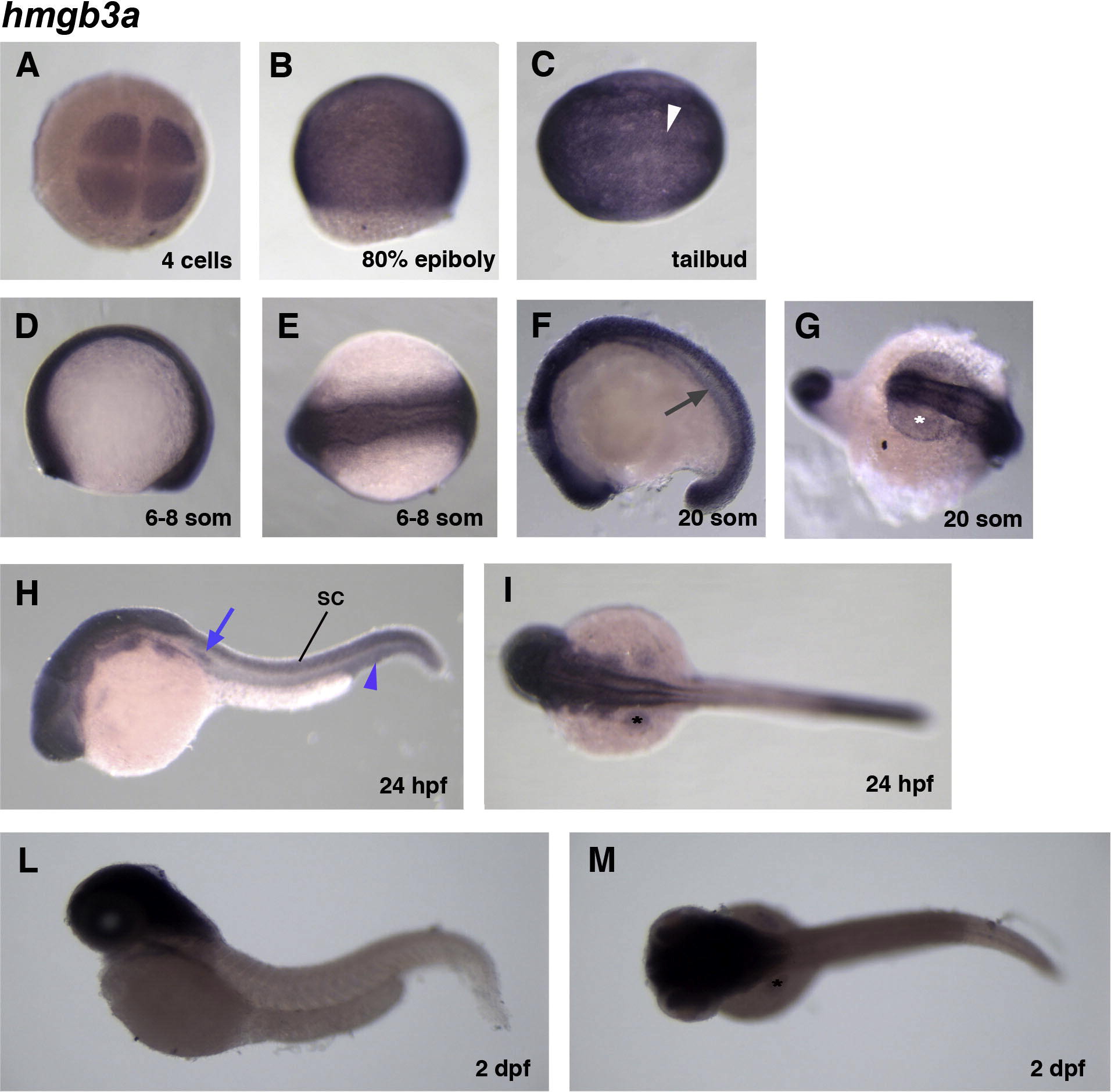 Fig. S6 Spatial expression of zebrafish hmgb3a. (A–C) At early developmental stages hmgb3a is ubiquitously expressed, and at tailbud stage it is particularly expressed at the midline (C, white arrowhead). (D–G) Even during somitogenesis it is broadly expressed, with the exception of notochord, somites (F, grey arrow) and eyes (G, white asterisk). (H and I) At 24 hpf, hmgb3a expression is restricted to specific regions of the embryos, mainly in the CNS, but is also visible in the spinal cord (SC), in the lateral line primordium (H, blue arrow), in the intermediate cell mass (H, blue arrowhead) and weakly in pectoral fin buds (I, asterisk). (L–M) At 2 dpf the signal is detectable in the rostral CNS and weakly in pectoral fin buds (M, asterisk). All panels show whole-mount images. (A, C, E, G, I and M) Dorsal views; (B, D, F, H and L) lateral views, anterior to the left. All images are taken at 40× magnification. Prolonged staining was performed at all stages to better visualize the expression pattern. No significant signal was obtained in ISHs performed with a sense probe (data not shown).