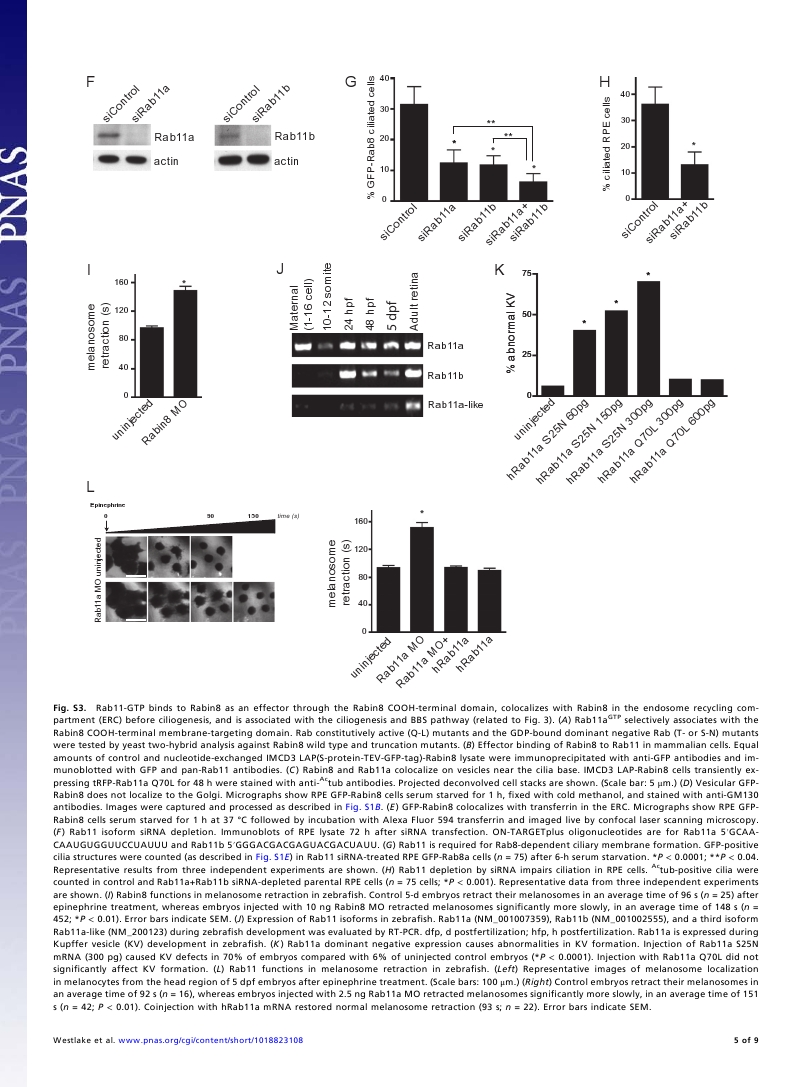 Fig. S3 Rab11-GTP binds to Rabin8 as an effector through the Rabin8 COOH-terminal domain, colocalizes with Rabin8 in the endosome recycling compartment (ERC) before ciliogenesis, and is associated with the ciliogenesis and BBS pathway (related to Fig. 3). (A) Rab11aGTP selectively associates with the Rabin8 COOH-terminal membrane-targeting domain. Rab constitutively active (Q-L) mutants and the GDP-bound dominant negative Rab (T- or S-N) mutants were tested by yeast two-hybrid analysis against Rabin8 wild type and truncation mutants. (B) Effector binding of Rabin8 to Rab11 in mammalian cells. Equal amounts of control and nucleotide-exchanged IMCD3 LAP(S-protein-TEV-GFP-tag)-Rabin8 lysate were mmunoprecipitated with anti-GFP antibodies and immunoblotted with GFP and pan-Rab11 antibodies. (C) Rabin8 and Rab11a colocalize on vesicles near the cilia base. IMCD3 LAP-Rabin8 cells transiently expressing tRFP-Rab11a Q70L for 48 h were stained with anti-Actub antibodies. Projected deconvolved cell stacks are shown. (Scale bar: 5 μm.) (D) Vesicular GFPRabin8 does not localize to the Golgi. Micrographs show RPE GFP-Rabin8 cells serum starved for 1 h, fixed with cold methanol, and stained with anti-GM130 antibodies. Images were captured and processed as described in Fig. S1B. (E) GFP-Rabin8 colocalizes with transferrin in the ERC. Micrographs show RPE GFPRabin8 cells serum starved for 1 h at 37 °C followed by incubation with Alexa Fluor 594 transferrin and imaged live by confocal laser scanning microscopy. (F) Rab11 isoform siRNA depletion. Immunoblots of RPE lysate 72 h after siRNA transfection. ON-TARGETplus oligonucleotides are for Rab11a 52GCAACAAUGUGGUUCCUAUUU and Rab11b 52GGGACGACGAGUACGACUAUU. (G) Rab11 is required for Rab8-dependent ciliary membrane formation. GFP-positive cilia structures were counted (as described in Fig. S1E) in Rab11 siRNA-treated RPE GFP-Rab8a cells (n = 75) after 6-h serum starvation. *P < 0.0001; **P < 0.04. Representative results from three independent experiments are shown. (H) Rab11 depletion by siRNA impairs ciliation in RPE cells. Actub-positive cilia were counted in control and Rab11a+Rab11b siRNA-depleted parental RPE cells (n = 75 cells; *P < 0.001). Representative data from three independent experiments are shown. (I) Rabin8 functions in melanosome retraction in zebrafish. Control 5-d embryos retract their melanosomes in an average time of 96 s (n = 25) after epinephrine treatment, whereas embryos injected with 10 ng Rabin8 MO retracted melanosomes significantly more slowly, in an average time of 148 s (n = 452; *P < 0.01). Error bars indicate SEM. (J) Expression of Rab11 isoforms in zebrafish. Rab11a (NM_001007359), Rab11b (NM_001002555), and a third isoform Rab11a-like (NM_200123) during zebrafish development was evaluated by RT-PCR. dfp, d postfertilization; hfp, h postfertilization. Rab11a is expressed during Kupffer vesicle (KV) development in zebrafish. (K) Rab11a dominant negative expression causes abnormalities in KV formation. Injection of Rab11a S25N mRNA (300 pg) caused KV defects in 70% of embryos compared with 6% of uninjected control embryos (*P < 0.0001). Injection with Rab11a Q70L did not significantly affect KV formation. (L) Rab11 functions in melanosome retraction in zebrafish. (Left) Representative images of melanosome localization in melanocytes from the head region of 5 dpf embryos after epinephrine treatment. (Scale bars: 100 μm.) (Right) Control embryos retract their melanosomes in an average time of 92 s (n = 16), whereas embryos injected with 2.5 ng Rab11a MO retracted melanosomes significantly more slowly, in an average time of 151 s (n = 42; P < 0.01). Coinjection with hRab11a mRNA restored normal melanosome retraction (93 s; n = 22). Error bars indicate SEM.