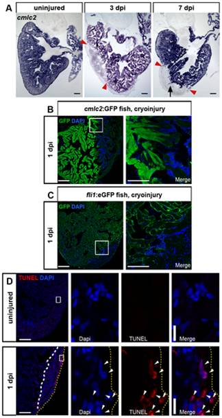 (A) In situ hybridization shows loss of cmlc2 (myl7) expression in the lesioned area at 3 and 7 dpi. The lesioned area is indicated by red arrowheads. Note the protrusions of cmlc2 positive areas (black arrow) extending into the lesion at 7 dpi. Scale bars are 100 μm. n = 3 hearts (9 sections each) for each uninjured, 3 dpi and 7 dpi. (B) Loss of cmlc2 expression is already evident in cryoinjured hearts at 1 dpi of cmlc2:GFP transgenic fish stained for GFP by immunofluorescence. Nuclei are stained with Dapi. Scale bar in overview is 100 μm, 25 μm in close-up. (C) Endocardial GFP expression is lost in cryolesions of fli1:eGFP transgenic fish at 1 dpi. (D) TUNEL assay on hearts at 1 dpi detects an increased number of apoptotic cells (white arrowheads) compared to uninjured hearts. Wound area is indicated by white dashed line and the periphery of the heart is marked by yellow dashed lines. Nuclei are stained with Dapi. Scale bar in overview is 100 μm. Scale bar in close up is 10 μm. n = 3 hearts each uninjured and 1 dpi.