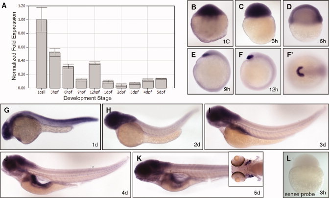 Fig. 2 lzap is expressed during epiboly and organogenesis. A: Relative expression of lzap mRNA in developing fish embryos. lzap expression was determined by quantitative reverse transcriptase-polymerase chain reaction (qRT-PCR) at indicated developmental stages and normalized to β-actin expression. hpf, hours postfertilization; dpf, days postfertilization. B–K: Representative photographs of lzap expression during development as determined by in situ hybridization. Embryos are depicted in lateral view, except for the animal pole view shown in F′. B–D: Ubiquitous expression of maternal lzap was detected throughout cleavage stages (B,C) and expression was maintained into early epiboly (D). E,F: After epiboly from 9–12 hpf, lzap expression was concentrated in the precordal plate and areas corresponding to the future hatching gland. G,H: At 1 days post fertilization (dpf) to 2 dpf lzap expression was more intense in the central nervous system (CNS), eye, and pharyngeal region. I: lzap staining was visible in the developing pharynx region, pharyngeal arches and in the primordial of the gastrointestinal organs at 3 dpf. J,K: lzap mRNA was detected at 4–5 dpf (J,K) in the pancreas and gastrointestinal tube, jaw and pharynx region, tectum, gills (see inset, K), and the hindbrain regions. L: Negative control with sense probe at 3 hpf reveals no staining.