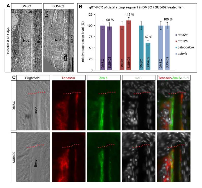 (A) FGF signaling is not required for ultrastructural changes in distal stump osteoblasts. Transmission electron micrographs of DMSO and SU5402 treated fins at 1 dpa. In DMSO treated fins, osteoblast nuclei (Nuc) have a rounded shape and are surrounded by extracellular matrix (ECM). In SU5402 treated fins osteoblast nuclei are equally rounded and cells are also surrounded by ECM. Epid = epidermis. Scalebar 2 μm.