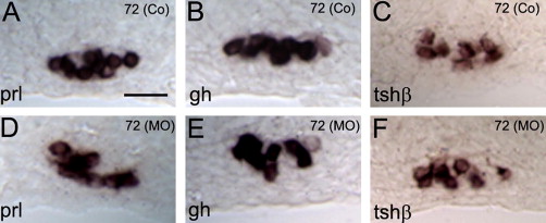 ISH on transverse sections of controls (Co; A–C) and prop1 MO (MO; D–F) injected embryos at 72 hpf using RNA probes for the pituitary lineage specific markers prl gh and tshβ. All three markers were strongly expressed in the pituitaries of both control and morphant embryos. Impaired cellular organization was observed for lactotrope (D vs. A) and somatotrope (E vs. B) lineages while thyrotropes were apparently unaffected by prop1 deficiency (F vs. C). Age in hpf and (treatments) are indicated in the upper-right hand corner; gene names in the lower-left corner. All panels are equally scaled (scale bar = 25 μm).