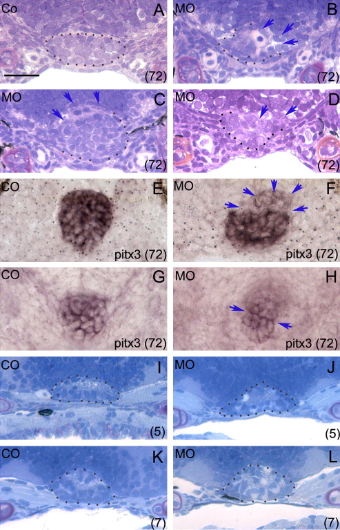 Pituitary histology in prop1 MO and control injected embryos observed on plastic sections (A–D; I–L) and by ISH using pitx3 probe mRNA (E–H). (E/F) are ISH on cryosections while (G/H) are whole mounts subsequently sectioned with vibratome. Treatments are indicated in the upper left corner. Gene names and stages are indicated in the lower-right corner of each panel (A–H, hpf; I–L, dpf). Dotted lines delimit detectable pituitary boundaries; blue arrows point to altered morphology. All panels are equally scaled (scale bar = 25 μm).