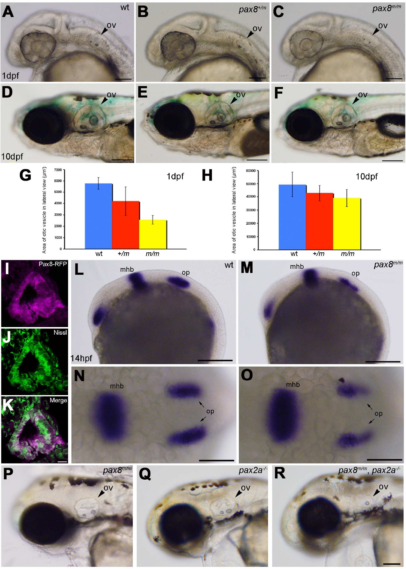 (Magenta-green version of Figure 4 for the assistance of color blind readers) Otic vesicle formation defects in pax2a/pax8 mutants. A-F: The otic vesicle (ov) size is slightly reduced in pax8m/m fish. Lateral view of the head region at 1 dpf (A, B, C) and 10 dpf (D, E, F). A and D are the wild type (wt), B and E are pax8+/m, and C and F are pax8m/m. Scale: 100 μm (A, B, C), 200 μm (D, E, F). G, H: The area of the otic vesicle as measured in the lateral view at 1 dpf (G) and 10 dpf (H). Wild type (Blue), pax8+/m (Red), and pax8m/m fish (Yellow). The average and the standard deviation are shown (n=6 each). I, J, K: C. RFP (+) cells (I) line the cavity of the otic vesicle, as visualized by the Nissle counterstain (J) at 1dpf. The merged picture is shown in K. Scale 10 μm. L-O: In situ hybridization with pax2a probes in wild type (L, N) and pax8m/m embryos (M, O) at 14 hpf. Pax2a expression is detected in retina, mhb and the otic placode (op) in wild type. Note the signal in the otic placode is weaker in pax8m/m embryo. The difference is more obvious in the higher magnification of the dorsal view (N and O). Scale: 200 μm (L, M), 100 μm (N, O). P, Q, R: The reduction of the otic vesicle size is more pronounced in the pax2a/pax8 double mutant. The lateral view of the head is shown for pax8m/m (P), pax2a-/- (Q) and pax2a/pax8 double mutant embryos at 2 dpf(R). Scale: 100 μm.