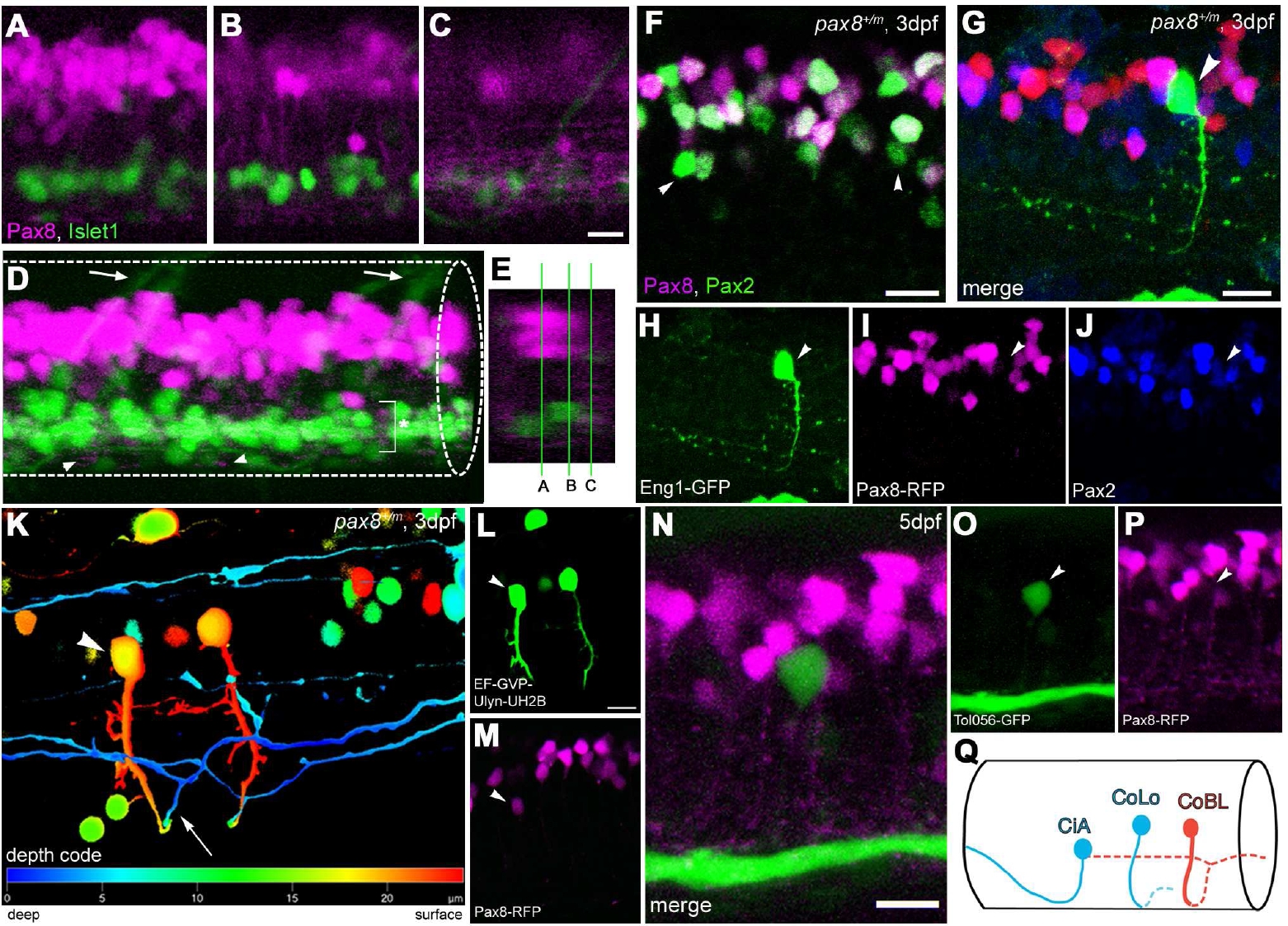 (Magenta/Green version of Figure. 6 for the assistance of color blind readers.) Interneurons in the spinal cord expressing pax2a or pax8. A-E: RFP (+) neurons are detected in the dorsal portion of the spinal cord; RFP (red), islet-1:GFP (green). Single place confocal images (A, B, C) show the position of RFP(+) cells and islet-1 expressing secondary motor neurons. Scale: 10 µm. D is the 3D reconstruction. Arrowheads indicate commissural axons labeled by RFP and arrows indicate motor neuron axons labeled by GFP. The area with an asterisk has a plexus-like structure of RFP (+) fibers. An optical cross section (E) displays the level of confocal planes corresponding to A, B and C. F: Pax8+/m fish stained with anti-Pax2; RFP (red), anti- Pax2 (green). Arrowheads are Pax2 (+) cells without RFP. Scale: 10 μm. G-J: CiA neurons express Pax2 but lack RFP expression. G is a stack of confocal images with eng1-GFP (green), RFP (red) and Pax2 (blue). H-J are single plane images to show that the GFP (+) cell is Pax2 (+) but RFP (-). Scale: 10 μm. K, L, M:.CoBL neurons express RFP. K is a stack of confocal images in depth coding. The cell with an arrow has the characteristic axon pattern of CoBL. In single planes, the GFP (+) cell is also RFP (+) (L and M). Scale: 10 μm. N, O, P: CoLo neurons labeled with GFP (green) in Tol-056 fish do not express RFP (red). N is a merged image. O and P show that the marked cell expresses GFP but not RFP. Scale: 10 μm. Q: Schema of CiA, CoLo and CoBL interneurons in the spinal cord. The position of the cell body and the axon projection are shown. Rostral to the left. Note that CiA and CoLo (blue) do not express RFP, while CoBL (red) express RFP.