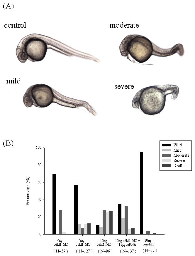 Knockdown of zcdkl1 produced defective phenotypes. Embryos at 1 to 4 cells stages received different dosages of morpholino. (A) Phenotype of zcdkl1 morphant at 24 HPF. Lateral view with the anterior pole to the left; (B) Percentages of defective phenotype produced by different dosages of zcdkl1 MO, 10 ng zcdkl1 MO plus 11 pg zcdkl1 mRNA, and 10 ng control MO. N value denotes the total injected embryos from three independent experiments.