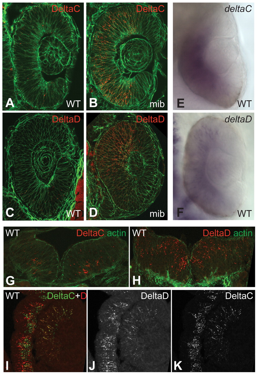 Fig. 3 Expression of DeltaC and DeltaD in retina and brain. (A-D) Sections of wild-type (WT) and mib mutant zebrafish retina at 24 hpf, immunostained with zdc2 and zdd2. (E,F) In situ hybridisation (ISH) of wild-type specimens (wholemounts) with probes detecting deltaC and deltaD mRNA. (G,H) Sections of hindbrain at 24 hpf, immunostained for DeltaC and DeltaD. (I-K) Section of retina and adjacent brain tissue in a 48 hpf embryo, doubly immunostained for DeltaC and DeltaD. In the retina the two proteins largely colocalise, but in the brain they are in distinct sets of cells. A-D and I-K are single confocal optical sections of 15 µm cryosections; G,H are projections of a small z-stack. A-D and G,H are counterstained for actin with fluorescent phalloidin (green).