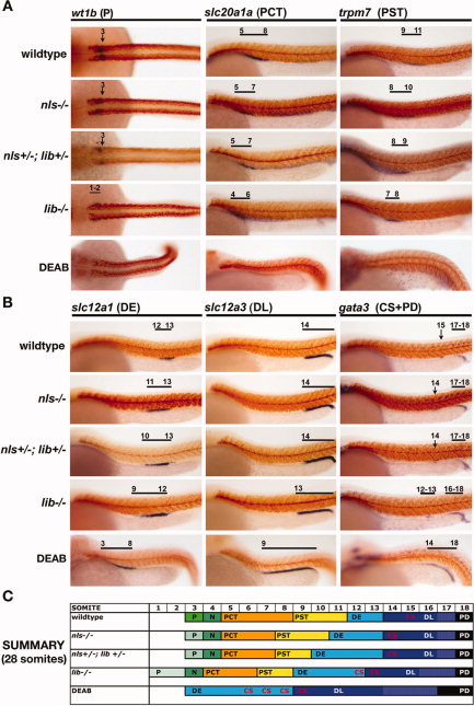 Fig. 5 Genetic and chemical models of retinoic acid (RA) biosynthesis deficiency exhibit a similar nephron segment phenotype of reduced proximal fates and expanded distal fates, and lib is the most severely affected aldh1a2 mutant. Whole-mount in situ hybridization analysis for nephron segment markers (purple) and mhc (red) at the 28 somite stage in aldh1a2 mutants and diaminobenzaldehyde (DEAB) -treated wild-type embryos. Embryos are shown in lateral views with anterior to the left, with the exception of dorsal views to show podocytes. Black brackets and arrows indicated expression domains, and numbers correspond to somite position. A,B: Proximal fates of podocytes, the proximal convoluted tubule (PCT) and proximal straight tubule (PST), were all reduced in the absence of RA biosynthesis (A), whereas distal fates of the distal early (DE), distal late (DL), corpuscle of Stannius (CS), and pronephric duct (PD) were expanded (B). C: Summary of nephron segmentation with respect to embryo somite number. Each color represents a different epithelial population: podocytes (green), PCT (orange), PST (yellow), DE (light blue), CS (red lettering indicates location among nephron tubule cells), DL (dark blue), and PD (black), and the overlap between DL and PD-expressed genes is indicated in white. The nephron segment phenotypes among RA-deficient zebrafish embryos showed a graded severity such that: nls homozygote < nls/lib compound heterozygotes < lib homozygotes < DEAB-treated wild-type embryos.