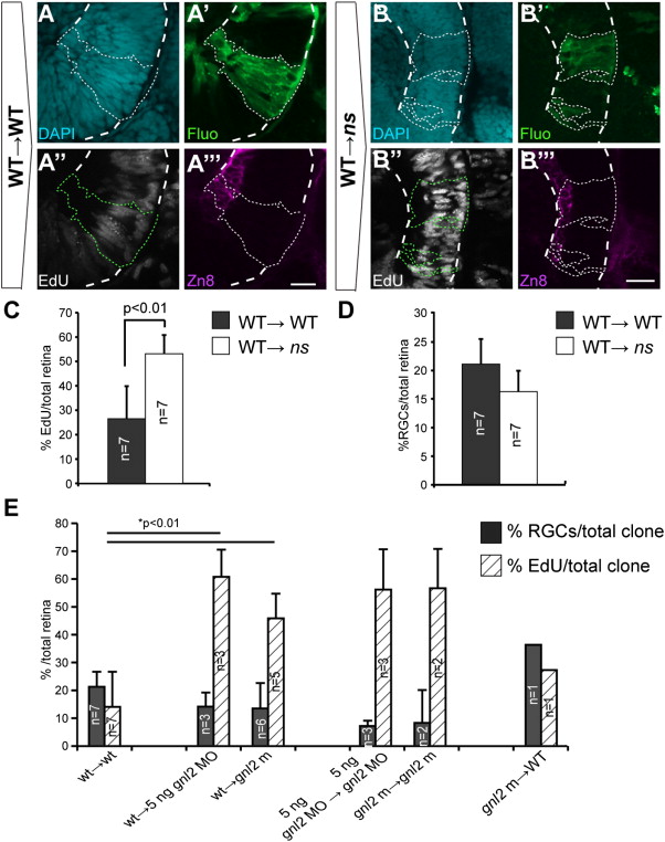 Gnl2 and NS act non-cell autonomously in retinal cell cycle exit and neuronal differentiation. (A and B) Single-plane confocal images of clones of transplanted cells showing DAPI-counterstained nuclei (cyan, top left), streptavidin-Alexa488 (green, top right), EdU (white, bottom left) and zn8-stained RGCs (magenta, bottom right). Clones of transplanted cells are outlined by dotted lines (white or green). The retina is outlined with dashed white lines. Shown are clones transplanted from WT donor to WT host (A) and WT donor to ns mutant host (B). (C and D) Quantification of the percentage of EdU+ (C) and zn8+ RGCs (D) within transplanted clones for WT→WT and WT→ns mutant. Statistics: Two-tailed Student′s t-test, p-values indicated above the bars (*p < 0.01, **p < 0.02). Error bars represent standard deviation. (E) Quantification of the percentage of EdU+ (striped bars) and zn8+ RGCs (black bars) within transplanted clones for additional experimental groups regarding gnl2 in addition to the data shown in Fig. 7F (with the exception of WT→WT and WT→gnl2 mutant which are shown in both Fig. 7F and here).