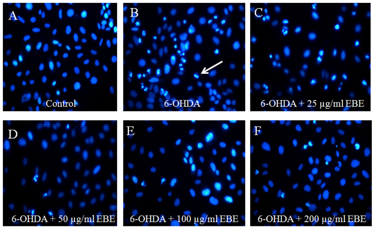 EBE reduced apoptosis induced by 6-OHDA in PC12 cells. Cells were stained with DNA-binding fluorescent dye Hoechst 33342. (A) Control: untreated group; (B) 6-OHDA-treated group (1 mM, 8 hours): chromatin condensation and DNA fragmentation were indicated by the white arrows; (C-F) EBE-pretreated groups (25, 50, 100 and 200 μg/mL respectively, 12 hours), followed by 6-OHDA exposure (1 mM, 8 hours): less apoptotic bodies were identified, colony reduction and cell shrinkage induced by 6-OHDA were also reversed.