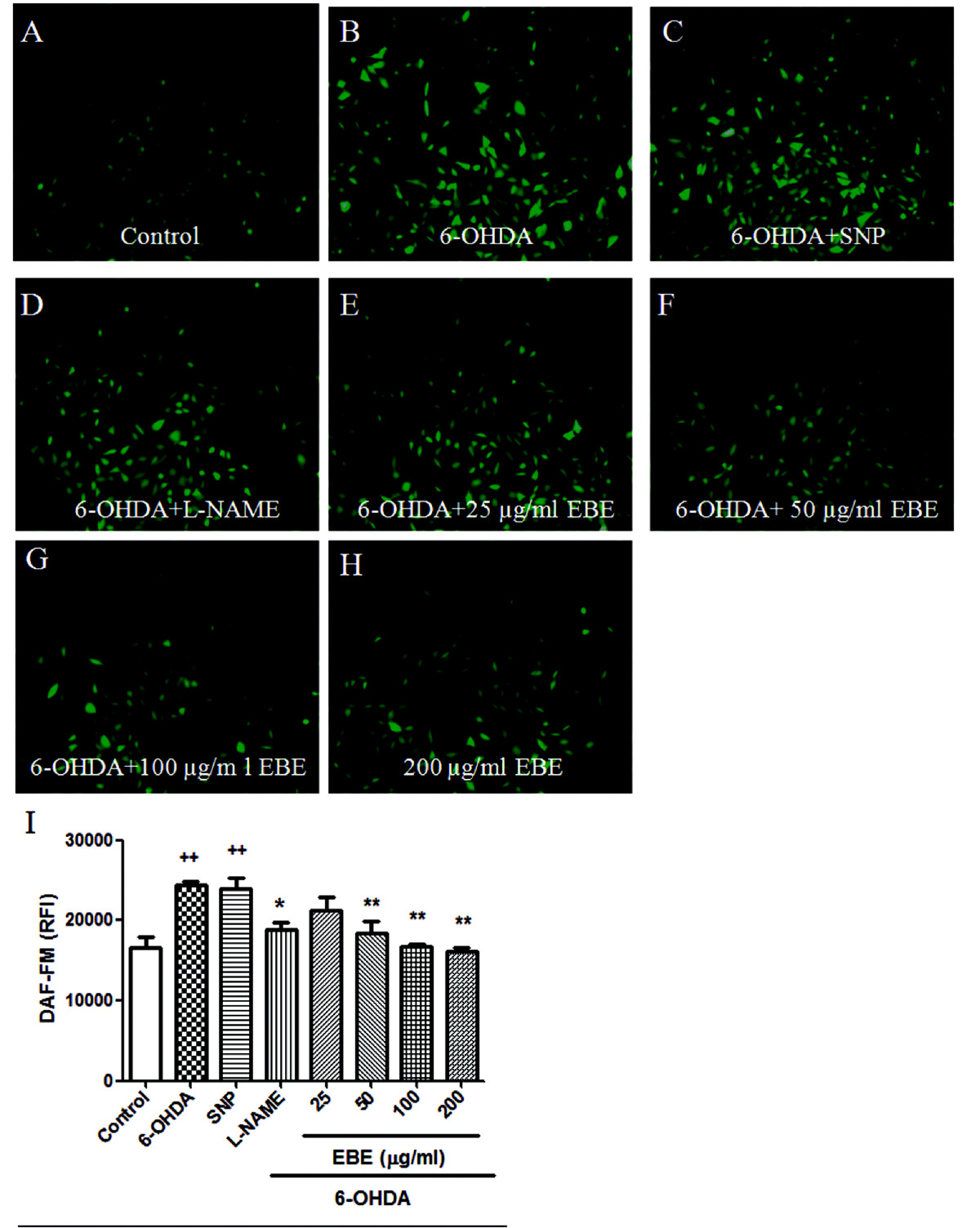 EBE inhibited 6-OHDA-induced nitric oxide (NO) over-production in PC12 cells. PC12 cells were pretreated with or without 250 μM L-NAME, 100 μM SNP and 25, 50, 100 and 200 μg/mL EBE for 12 hours, then exposed to1 mM 6-OHDA for another hour. (A-H) Intracellular NO was identified using fluorescent indicator, DAF-FM diacetate; (I) The NO fluorescent intensity was quantified by a multi-label counter. ++ P = 0.008 versus control group (without 6-OHDA treatment); * P = 0.044 versus OHDA group; ** P = 0.005 versus OHDA group. All experiments were repeated 3 times.
