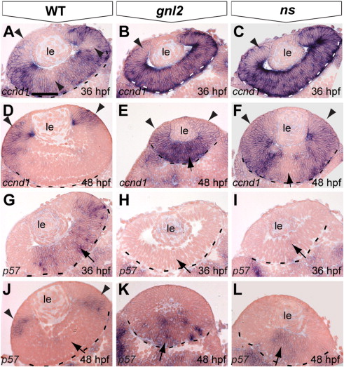 Aberrant expression of cell cycle regulators in gnl2 and ns mutant retinae. (A–F) Transverse sections showing expression of ccnd1 at 36 hpf (A–C) and 48 hpf (D–F). In the WT retina, a subset of cells has downregulated ccnd1 (arrowheads in A), indicating their withdrawal from the cell cycle. At 48 hpf, ccnd1 is restricted to the ciliary marginal zone that remains proliferative (arrowheads in D). In contrast, ccnd1 is not downregulated in gnl2 (n = 10; B) or ns (n = 10; C) mutant retinae at 36 hpf (arrowheads) and remains expressed in the central retina of gnl2 mutants (n = 9; arrow in E). In ns mutants, ccnd1 expression is downregulated in the central retina (n = 9; arrow in F), but remains expressed in the remainder of the retina (arrowheads). (G–L) Sections showing expression of p57kip2 in the WT central retina at 36 hpf (arrow in G). In contrast, there is no expression in gnl2 (n = 11; H) and ns (n = 9; I) mutant retinae (arrows). At 48 hpf, p57kip2 expression is restricted to the lateral surface of the retina in WTs (arrowheads in J). In contrast, p57kip2 is expressed in the central retina of gnl2, (n = 12; arrow in K) and ns mutants (n = 13; arrows in L). Dashed lines indicate outline of the retina. Dorsal view, anterior to the left. le, lens. Scalebar 25 μm.