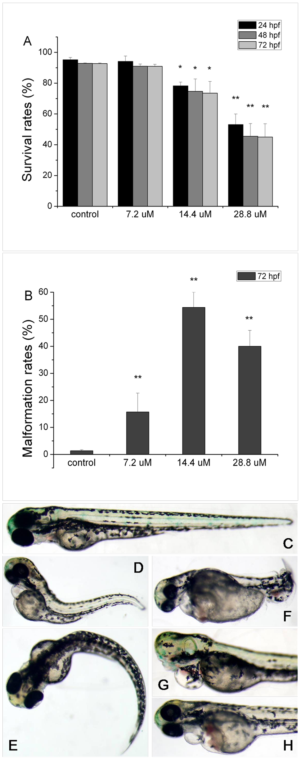 (A) The survival rates of embryos after MC-RR exposure at 24, 48 and 72 hpf, respectively. (B) The malformation rates of embryos after MC-RR treatment at 72 hpf. Various morphological deformities were detected in MC-RR-treated embryos, including bent tail/body axes (D, E, F), cyclopia (G), as well as edema in pericardial sac (PS) and hatching gland (HG) (H), compared to control embryos (C). Values are expressed as mean ± SD (*indicates significant change compared to control at p<0.05, **indicates significant change compared to control at p<0.01).