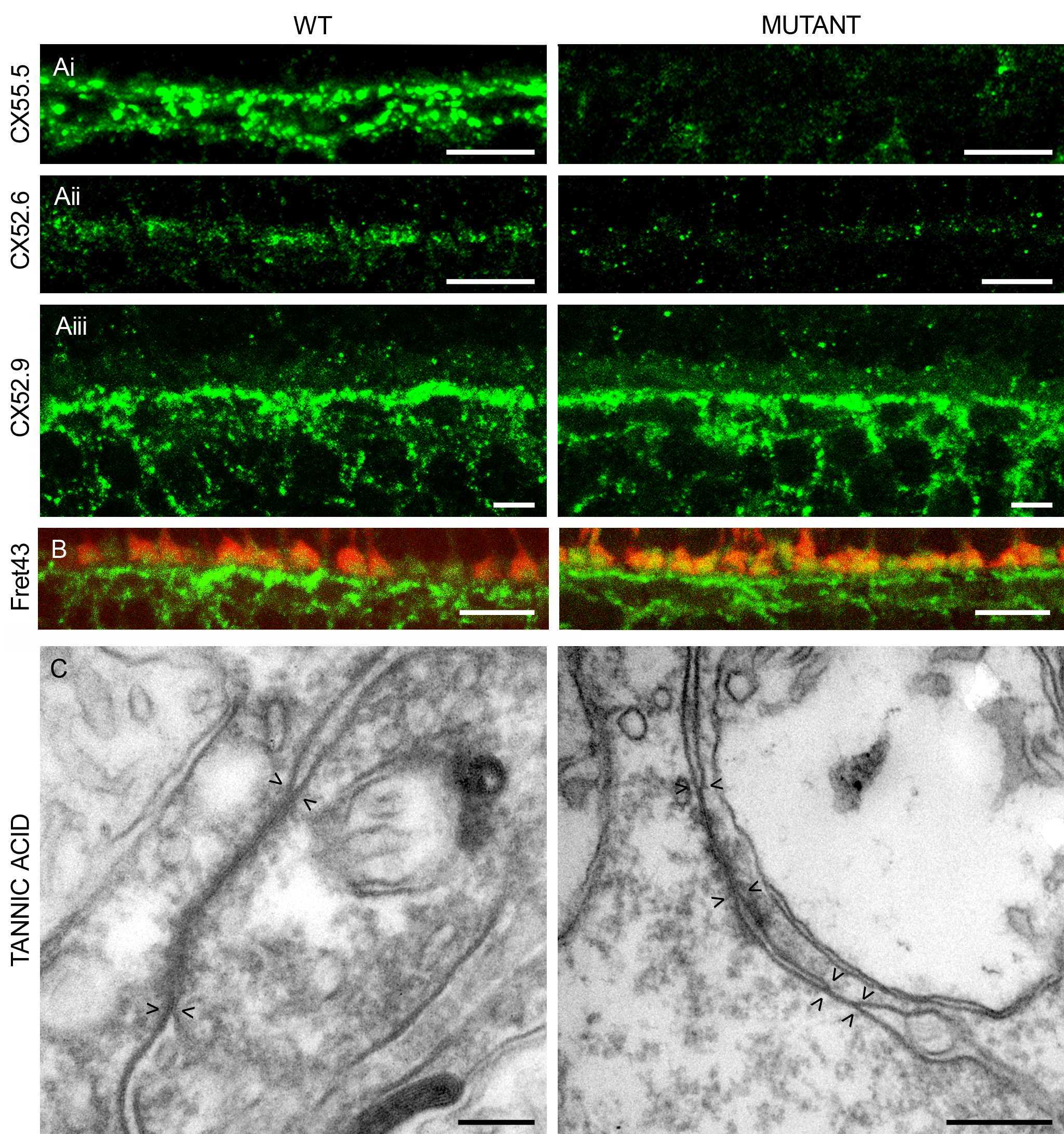 (A) Immunocytochemical staining with antibodies against Cx55.5 (i), Cx52.6 (ii), and Cx52.9 (iii). Cx55.5-IR and Cx52.6-IR are absent in the mutant, whereas Cx52.9-IR remains present or even becomes stronger. Scale bar = 10 μm. (B) Double labeling of Cx52.9 (green) and FRet43 (red), a label for double cones. The Cx52.9-IR and FRet43-IR are closely associated, indicating that Cx52.9-IR is present in the dendrites of horizontal cells invaginating the cone synaptic terminal in both wild-type and mutant. Scale bar = 10 μm. (C) Tannic acid staining of gap-junctions in wild-type and mutant retinas. Pairs of arrow heads indicate the extent of the gap-junction. Often the gap-junctions in the mutant seem to be “split” as is illustrated in this figure. On average, gap-junctions are smaller in the mutant retinas. Scale bar = 0.5 μm.