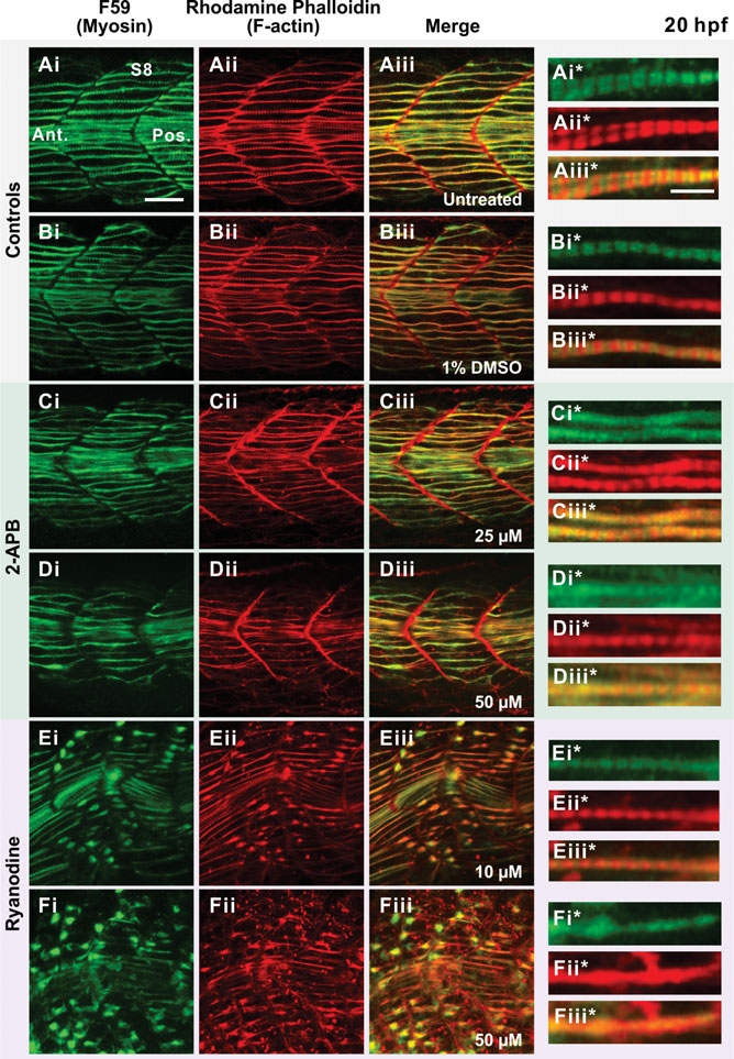 Effect of 2-APB and ryanodine on the organization of the trunk musculature and the formation of sarcomeres. Embryos were either (A) untreated (controls) or else (B-F) treated from 17 hpf to 20 hpf with: (B) 1% DMSO (DMSO control); (C,D) 2-APB at (C) 25 μM or (D) 50 μM; or (E,F) ryanodine at (E) 10 μM or (F) 50 μM. Embryos were then fixed and the myosin and F-actin labeled with (Ai-Fi) the F59 myosin heavy chain antibody and (Aii-Fii) rhodamine-phalloidin, respectively. (Aiii-Fiii) The merged myosin and F-actin images, with the overlapping regions shown in yellow. (Ai*-Aiii* to Fi*-Fiii*) Higher magnification views of (Ai-Aiii - Fi-Fiii), respectively, showing the level of sarcomeric banding in the slow muscle fibers in the untreated and drug treated embryos. Scale bars are (Ai-Aiii to Fi-Fiii) 25 μm and (Ai*-Aiii* to Fi*-Fiii*) 5 μm.