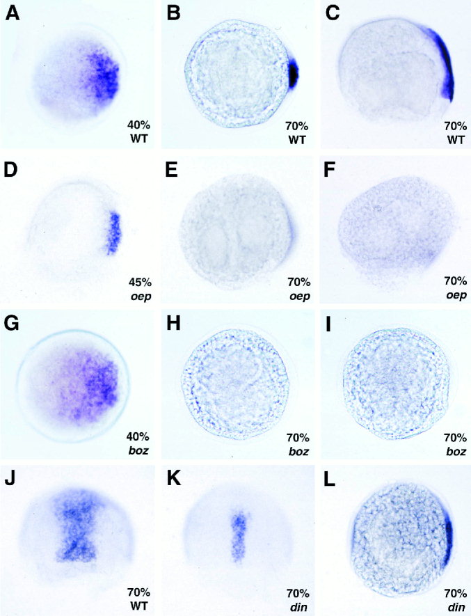 admp expression in positively regulated by Nodal signaling, Bozozok, and Chordin: (A–C,J) wild-type, (D–F) mzoep; (G–I) bozm168; (K,L) dintt250. (A,G) 40% epiboly, animal view; (D) 45% epiboly, animal view; (B,E,H) 70% epiboly, animal view; (C,F,I,L) 70% epiboly, lateral view; (J,K) 70% epiboly, dorsal view. Note that in the din mutant shown in L, admp expression is restricted to the mesoderm in the inner cell layers, whereas the neuroectoderm in the outer cell layers lacks admp transcripts (in contrast to the wild-type [WT] sibling shown in C).