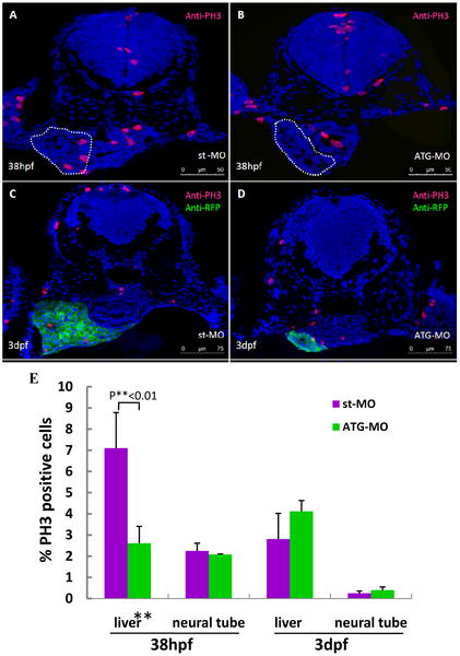 (A, B) Immunostaining using an anti-PH3 antibody on st-MO (A) and ATG-MO (B) morphants at 38hpf. Liver primordium is circled with a white dotted line. (C, D) Immunostaining using antibodies respectively against PH3 (red) and RFP (green) on cross-sections from st-MO (C) and ATG-MO (D) morphants in the Tg(lfabp: DsRed; elaA: EGFP) background at 3dpf. (E) Statistical analysis revealed that the ratio of PH3-positive cells was significantly reduced in the liver primordium of ATG-MO morphants at 38 hpf, but no significant difference in the ratio of PH3-positive cells was observed in the liver of ATG-MO morphants at 3dpf. Data was obtained by counting PH3-positive cells versus total cells in a specific organ (e.g. liver) in sections from at least 3 st-MO embryos and 3 ATG-MO morphants at each stage, respectively (Table S1).