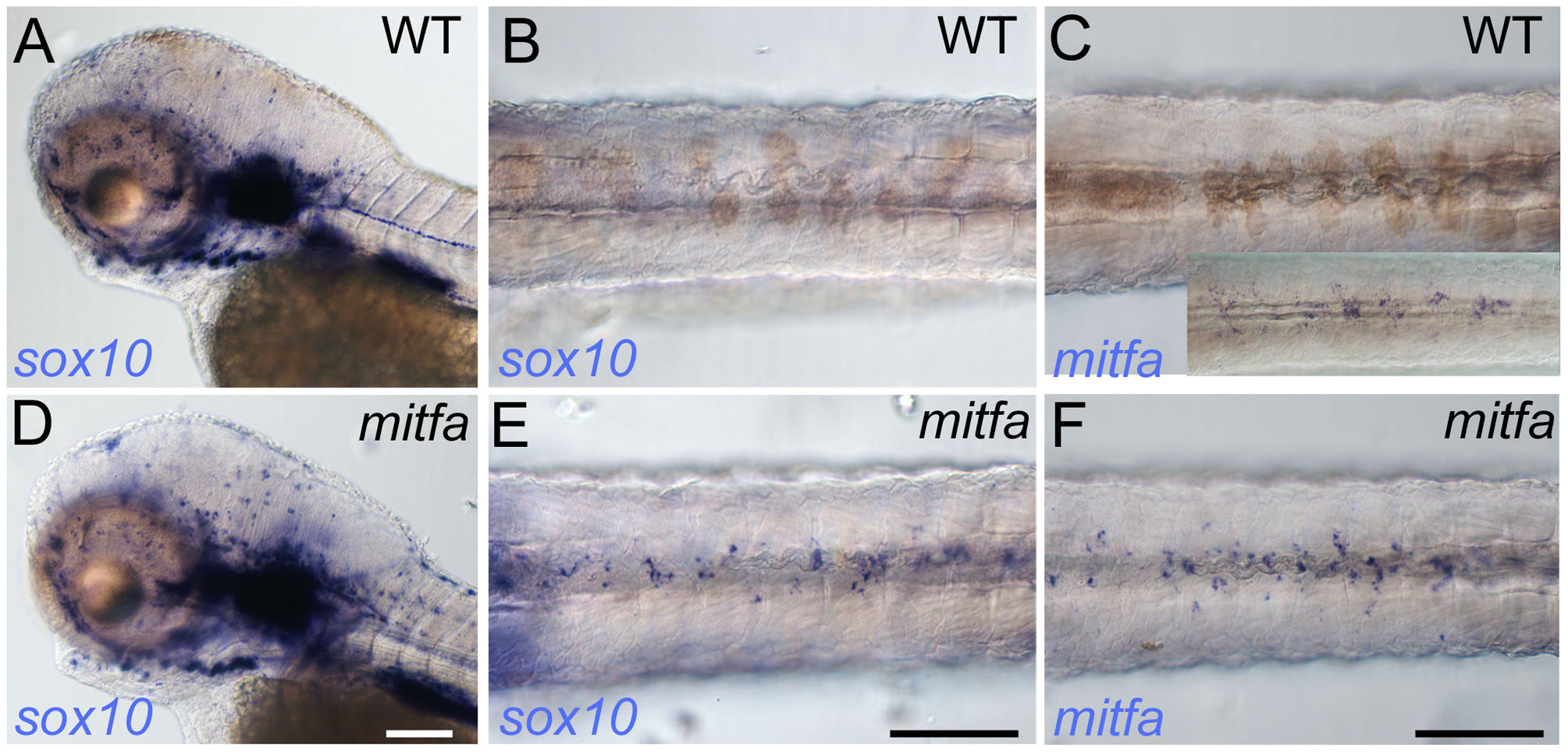Whole-mount in situ hybridisation shows prominent expression of sox10 in peripheral glia and ear in mutants (D) and WT siblings (A); expression in WT melanocytes is undetectable (B), but mitfa mutants show prominent expression in many cells in the position of the dorsal stripe (E). (C, F) At this same stage expression of mitfa in WT siblings is undetectable under conditions used in this experiment (C), but can be shown by enhancing sensitivity by increasing PTU inhibition of melanisation and extending the signal development time (C, inset). Mitfa expression is clearly enhanced in mitfa mutants (F). Note that WTs have been treated with 0.00075% PTU to limit melanisation. B,C,E,F) dorsal views of posterior trunk, focused just above spinal cord. Scale bars, 100 μm.