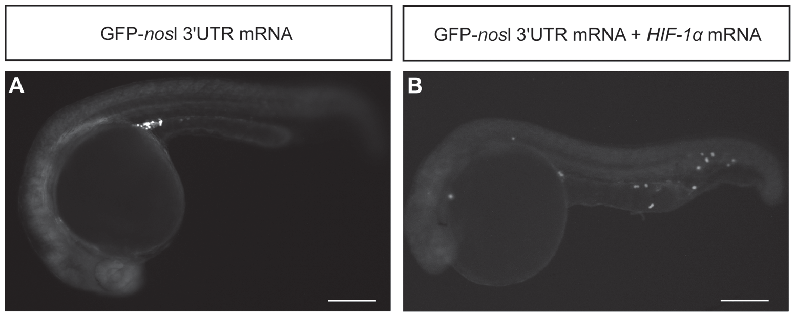(A) Embryos injected with GFP-nosl 32UTR mRNA. (B) Embryos co-injected with GFP-nosl 32UTR mRNA and HIF-1α mRNA. HIF-1α over-expressed embryos showed mis-migrated ectopic PGCs in the head, yolk sac extension and caudal region. HIF-1α over-expressed embryos displayed similar phenotypes as embryos exposed to hypoxia. Scale bar: 200 μm.