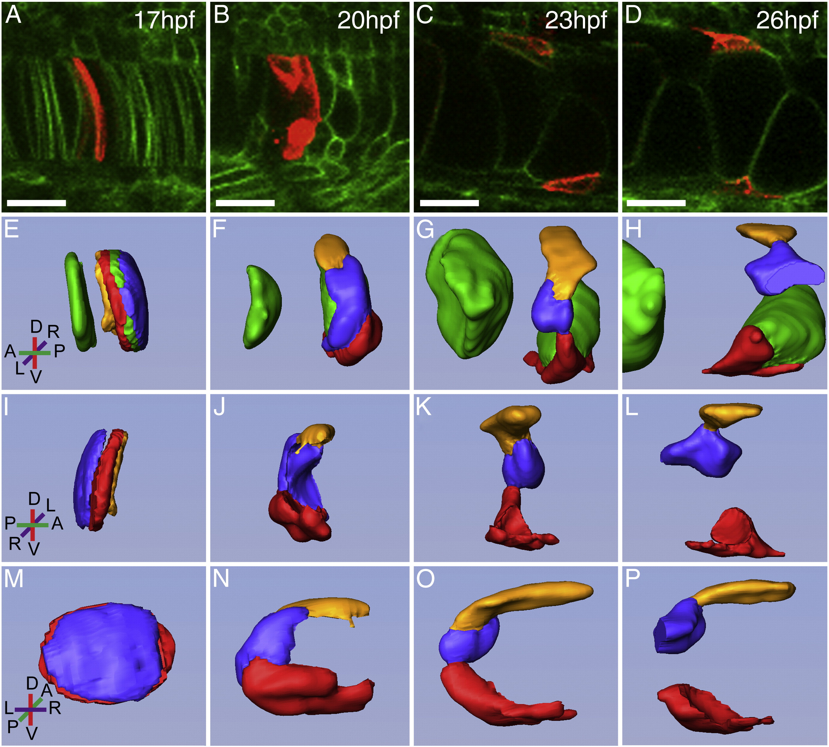 Fig. 5 Formation of the epithelial notochord sheath cells. (A–D) Confocal images of Tg(β-actin:HRAS-EGFP)vu119 fish injected with - 1.7kbcol2a1a:mCherry-CAAX plasmid to track the snapping, retraction, and spreading process of NSCs over the course of 9 h. (E–P) 3D rendering of labeled cells from confocal images. (E–H) Lateral right and I–L. left lateral view with green vacuolated cells removed. (M–P) posterior view along notochord axis. Coordinates indicate anterior/posterior (A/P), dorsal/ventral (D/V), and left/right (L/R) axes. Scale bar = 20 μm.