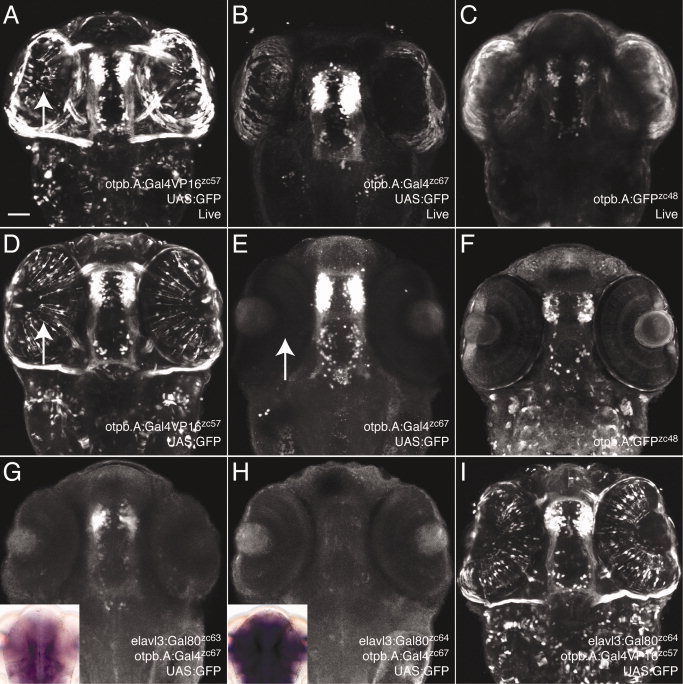 Fig. 2 Gal4 drives strong expression in stable transgenic lines and can be inhibited by Gal80. Confocal maximum projections of 72 hours postfertilization (hpf) embryos; ventral views, anterior to the top. Embryos are heterozygous for the genotypes shown. Arrow points to ectopic green fluorescent protein (GFP) expression in eyes driven by Gal4-VP16 (A,D) not noted using native Gal4 (E). A–C: Live embryos imaged with identical laser power settings, showing that Gal4-driven expression (B) is stronger than a direct enhancer:GFP construct (C) and is comparable to Gal4-VP16-driven expression (A). D–F: Immunohistochemistry for GFP in fixed embryos again shows that Gal4-dependent expression (E) is comparable to Gal4-VP16 (D), but has minimal expression in other tissues (such as eye muscles, arrow). F: The original transgenic enhancer line Tg(otpb.A:egfp)zc48 shows dimmer expression compared with Gal4-driven expression in E. G: A weakly expressing allele of elavl3:Gal80 only partially inhibits Gal4-dependent transgene expression. H: A strongly expressing elavl3:Gal80 allele completely inhibits Gal4-dependent expression. Insets for G and H show relative levels of Gal80 in situ expression. I: Gal80 is unable to inhibit Gal4-VP16-driven expression. Scale bar = 50μm.