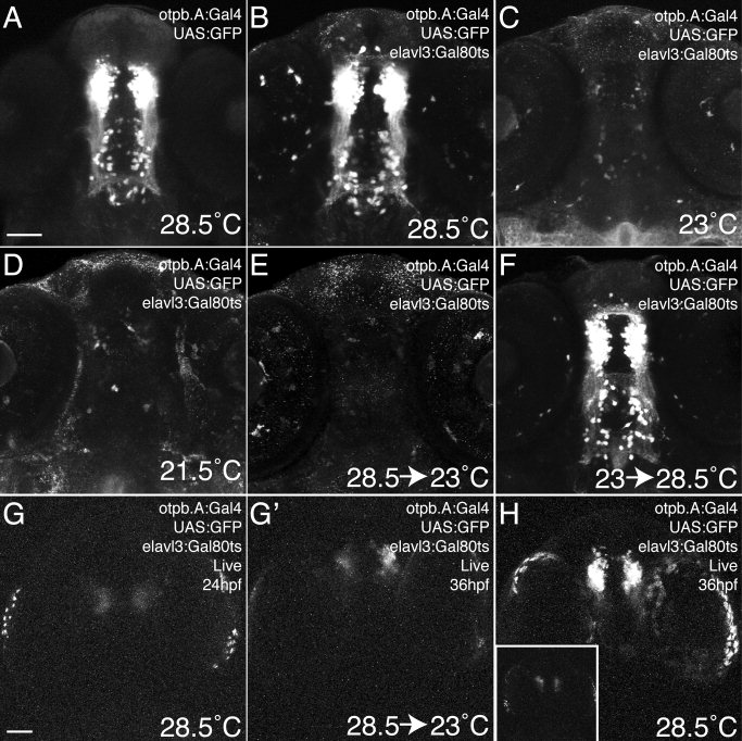 Fig. 4 Temporal control of Gal4-dependent expression using a temperature sensitive version of Gal80. Confocal maximum intensity projections, ventral views, anterior to top, 72 hours postfertilization (hpf) Tg(otpb.A:Gal4)zc67; Tg(UAS:GFP) embryos stained with anti-green fluorescent protein (GFP). A,B: Expression is indistinguishable between embryos without (A) or with (B) the Tg(elavl3:Gal80ts)zc68 transgene when raised at the restrictive temperature (28.5°C). C,D: When raised at permissive temperatures (21.5°C or 23°C) starting at 24 hpf, Gal80ts is able to effectively inhibit Gal4-dependent expression. E: When Gal4-dependent expression is initially allowed to occur from 24 to 48 hpf, shifting to the permissive temperature from 48–72 hpf allows Gal80ts to inhibit Gal4-dependent expression. F: Raising at a permissive temperature until 48 hpf, then relieving Gal80-mediated inhibition at 48 hpf permits Gal4-dependent expression to resume by 72 hpf. G,G′: Live confocal images of the same embryo before (at 24 hpf) and after (at 36 hpf) shifting to the permissive temperature, shows inhibition of Gal4-dependent expression. H: In comparison, a control embryo raised at the restrictive temperature only shows robust expression. Inset shows this same embryo at 24 hpf. Scale bar = 50 μm.