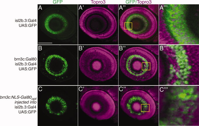 Fig. 5 Nuclear localization and codon optimization improves function of Gal80. Confocal maximum projections, lateral views, anterior to left, dorsal up, of eyes in Tg(isl2b.3:Gal4)zc65; Tg(UAS:GFP) 72 hours postfertilization (hpf) embryos. Immunostaining for green fluorescent protein (GFP), green; Topro3 nuclear stain, magenta. A–A′′ ′: Tg(isl2b.3:Gal4)zc65; Tg(UAS:GFP) transgenic embryos with no Gal80 show GFP expression in all retinal ganglion cells (RGCs). Inset and A′′ ′ shows high power magnification of single confocal slice. B–B′′ ′: Triple transgenic Tg(isl2b.3:Gal4)zc65; Tg(UAS:GFP); Tg(brn3c:Gal80) shows inhibition of Gal4-dependent GFP expression in approximately 30% of RGCs. Inset and B′′ ′ shows high power magnification of single confocal slice. C–C′′ ′: Transient injection with construct carrying “improved” Gal80 into Tg(isl2b.3:Gal4)zc65; Tg(UAS:GFP) embryos demonstrates inhibition similar to that of stable lines carrying native Gal80. Improved Gal80 has nuclear localization signal (NLS) and is codon optimized (“opt”). Scale bar = 50 μm.