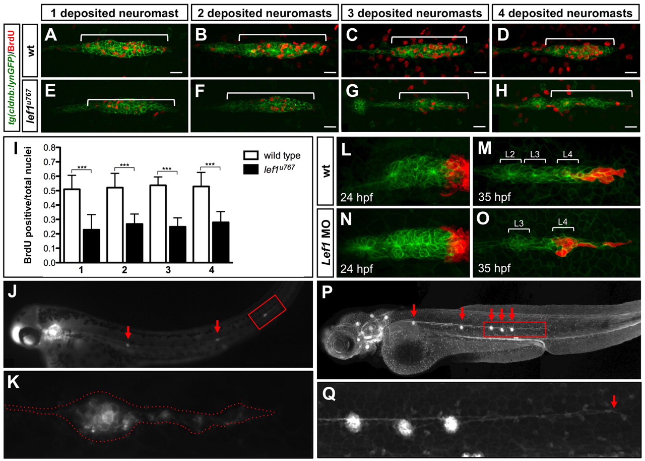 Fig. 5 Mutant PLL primordia collapse is due to decreased proliferation and depletion of leading zone cells. (A-H) Cell proliferation analysis in wild-type (A-D) and lef1u767 mutant (E-H) Tg(-8.0cldnb:lynEGFP)zf106 embryos. After BrdU pulse and chase, embryos were fixed after deposition of neuromast L1 (A,E), L2 (B,F), L3 (C,G) and L4 (D,H). Brackets show the primordium. Scale bars: 20 μm. (I) BrdU-positive cells/total cell ratio in wild type (white bars) and lef1u767 mutants (red bars) after one to four deposited neuromasts. Total cells where counted after DAPI staining nuclei. Significance was tested with Wilcoxon rank-sum test (***P<0.001). Data are mean+s.d. (J,K) 48 hpf aphidicolin/hydroxyurea-treated Tg(cldnb:lynGFP)zf106 embryos show three or four widely spaced neuromasts and a caudally extended row of cells (J). Red arrows indicate neuromasts. (K) Amplification of red rectangle in J. (L-O) Kaede photoconverted leading edge cells at 24 hpf in wild type (L) and lef1u767 (N) assessed at 35 hpf (M,O). Brackets indicate preformed neuromasts. (P,Q) Ablation of the caudal third of PLLP at 24 hpf leads to a lef1u767-like phenotype with 20%, 33.3% and 46.6% of the embryos displaying 3, 5 and 7 neuromasts respectively at 72 hpf (15 ablated specimens). Red arrows indicate neuromasts. (Q) Inset from P with red arrow showing the remaining migrating cells.
