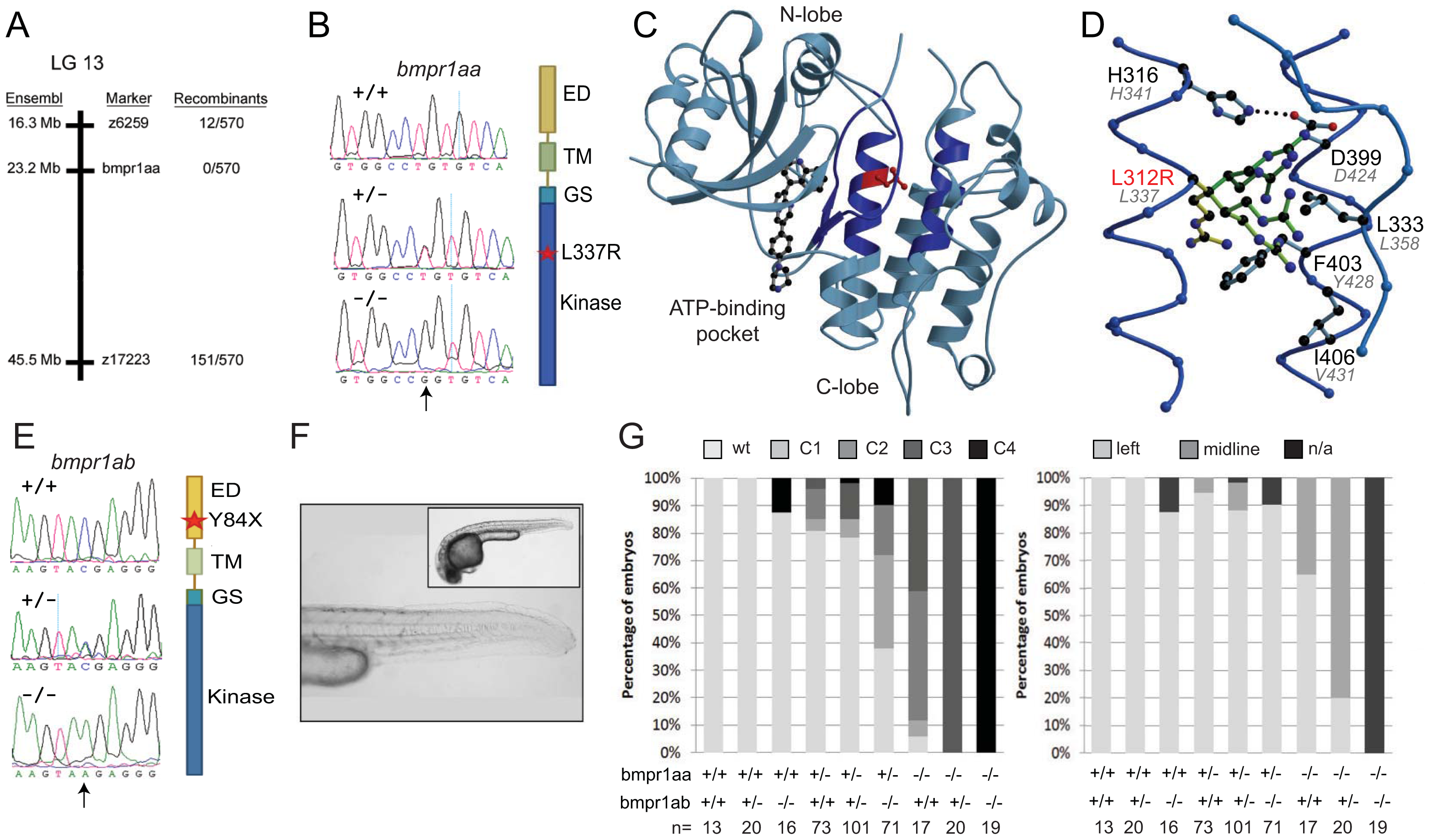 (A) The lin mutation was mapped to a region on chromosome 13 that includes the bmpr1aa gene. (B) T>A basepair change that was found in all lin mutant embryos results in a Leu to Arg change at position 337 (L337R). (C) Crystal structure of human BMPR1B. The kinase domain from the human BMPR1B with the kinase inhibitor LDN-193189 (ball-and-stick representation) bound to the ATP binding site (pdb entry 3MDY). Leu 312 (corresponding to Leu 337 in fish) is shown in red. Structural elements providing residues to the hydrophobic core surrounding Leu 312 are highlighted in dark blue. (D) Detailed view of the hydrophobic core surrounding Leu 312 (in red). Black labels refer to the structure of human BMPR1A, the corresponding residues in fish are indicated by grey italic labels. Consequences of the L312R mutation are analyzed by replacing the leucine side chain in the structure model with arginine, of which five typical rotamers are shown (yellow to green). All rotamers cause serious clashes with surrounding residue, which are highly conserved in fish. (E) C>A basepair change in the bmpr1ab gene that results in a premature stop codon at position 84 in the extracellular domain of the receptor. (F) A MZbmpr1ab mutant embryo at 2 dpf with no obvious phenotypes in the heart or tail region (magnified). (G) Bmpr1a dose-dependent effect on dorsoventral and left-right patterning. Embryos derived from an incross of bmpr1aa+/-bmpr1ab+/- double carrier fish was analyzed and quantified for the dorsoventral phenotypes (classified as C1 (mild) to C4 (strong)) and position of the heart (left or midline) if present. n/a, not applicable since no heart tissue was present.