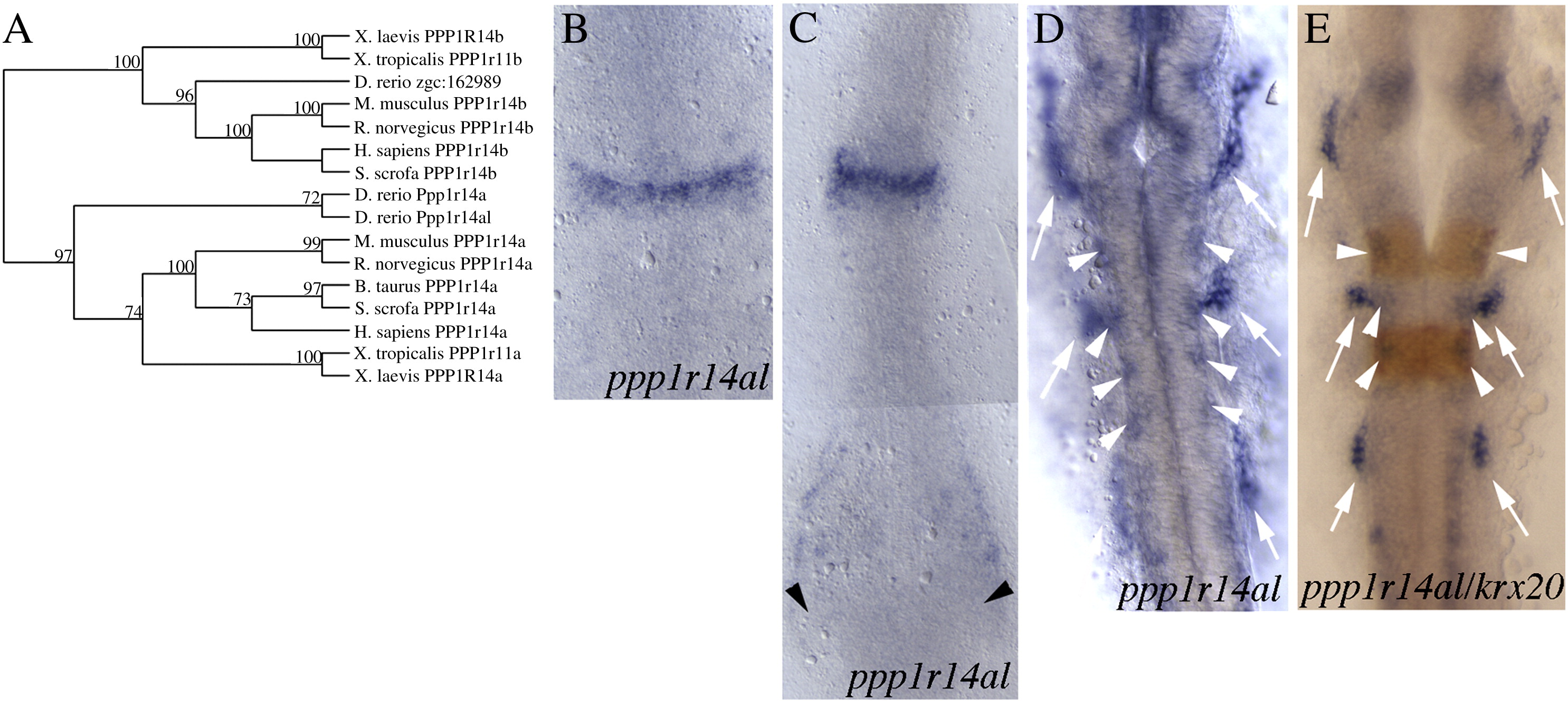 Sequence and expression analysis of the ppp1r14al gene. (A) Phylogenetic tree demonstrating that zebrafish ppp1r14al groups with other ppp1r14a genes, not with ppp1r14b genes. (B–E) ppp1r14al expression pattern at 9hpf (B), 11hpf (C) and 20hpf (D, E). Arrows indicate cranial placodes (D, E) and arrowheads indicate staining in ventral mesoderm (C) and in the lateral neural tube (D, E). E is a double in situ hybridization with krox20 detected in red. Embryos in B–E are shown as flat mounts in dorsal view with anterior to the top.