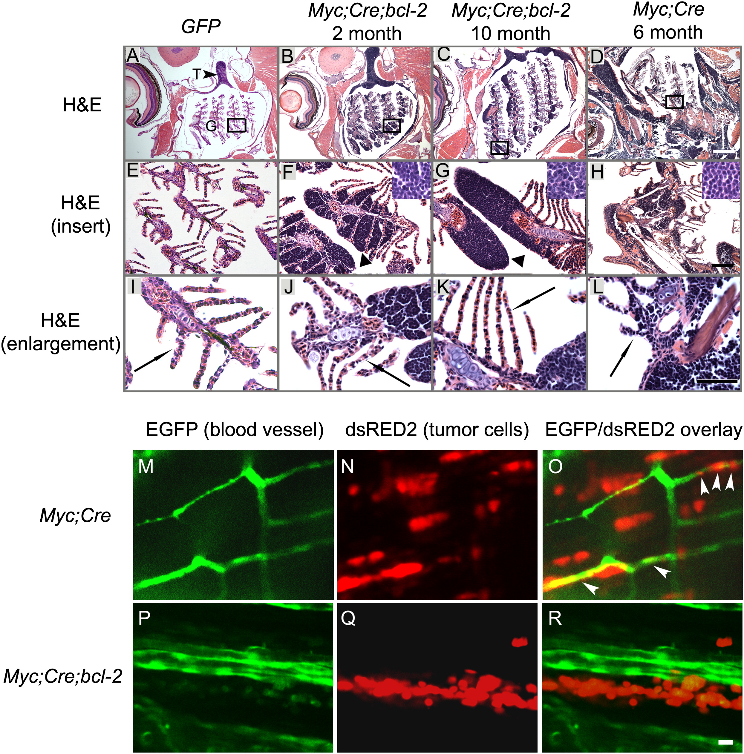 (B, C, F, G, J, and K) GFP and dsRED2-positive tumor cells (arrowheads; F,G) in the Myc;Cre;bcl-2 fish invade tissues outside the thymus and infiltrate local structures, including the primary lamellae (filaments) and cartilaginous gill rays by 2 months (B, F, and J; n = 3) but fail to invade vasculature by 10 months (C, G, and K; n = 3).