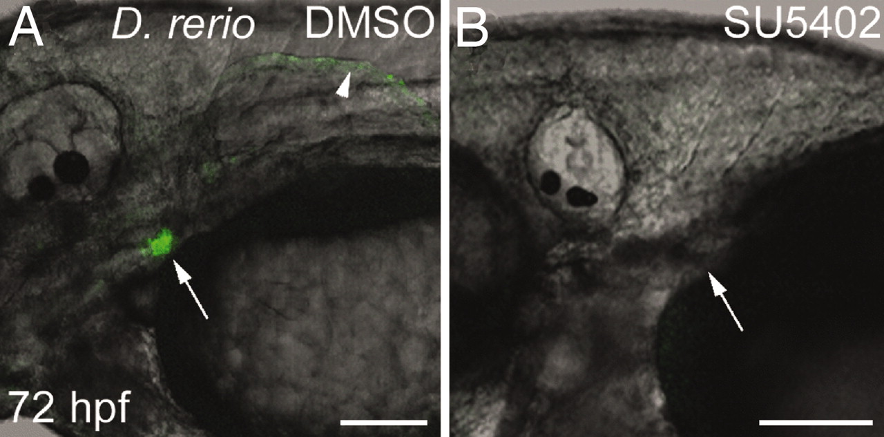 Fgf inhibition eliminates dlx2b:GFP reporter expression in zebrafish pharyngeal tooth germs. Tg(dlx2b:EGFP)wj1 treated from 30–72 hpf with either a DMSO control solution (A) or the Fgf inhibitor SU5402 (B). Pharyngeal tooth expression of the dlx2b:GFP reporter is eliminated with this treatment (arrows). Pectoral fin expression (arrowhead) is also absent, but no pectoral fin bud develops and this therefore may be the result of earlier Fgf requirements in fin development. (Scale bars: 100 μm.)