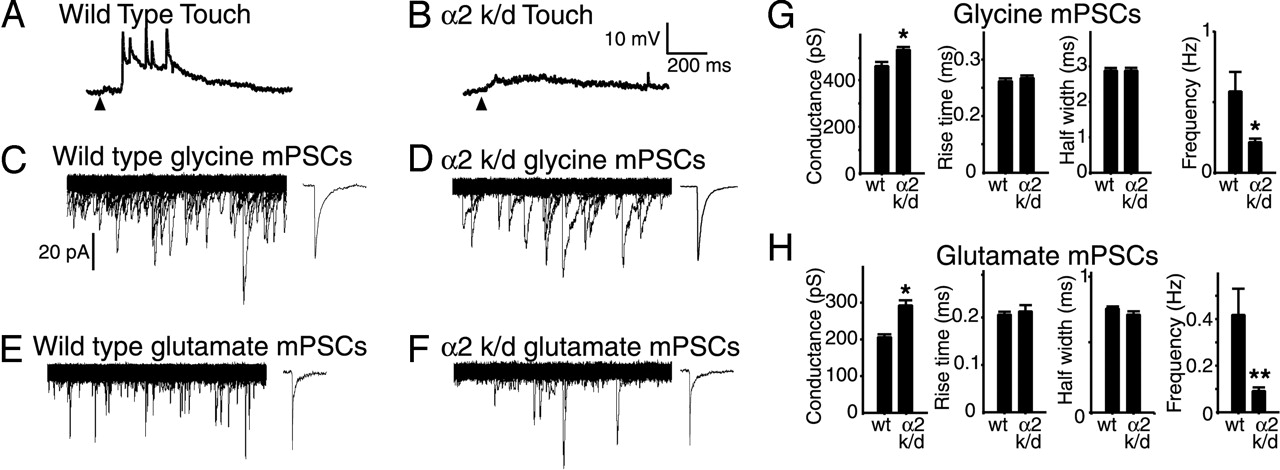 Synaptic activity is reduced in α2 GlyR knockdown fish. Spinal motoneuron responses evoked by brief touches in wild-type zebrafish (A; n = 5/5) and GlyR α2 knockdown zebrafish (B; α2 k/d; n = 9/9) at 3 days in development. Arrowheads indicate onset of touch. (C and D) Glycinergic mPSCs (isolated with 1 μM TTX, 10 μM bicuculline, and 1 mM kynurenic acid) in spinal motoneurons voltage-clamped at -60 mV in wild-type zebrafish (C; n = 11) and GlyR α2 knockdown zebrafish (D; α2 k/d; n = 10). Glutamatergic mPSCs (isolated with 1 μM TTX, 10 μM bicuculline, and 1 μM strychnine) in spinal motoneurons voltage-clamped at -65 mV in wild-type zebrafish (E; n = 12) and 3-day GlyR α2 knockdown zebrafish (F; n = 10). C–F Left display 500 overlaps of consecutive 200-ms traces of activity. C–F Right display 25 averaged mPSCs for each condition. (G and H) Peak conductance, rise time, half-width, and frequency of GlyR mPSCs (G) and glutamatergic mPSCs (H) in wild-type zebrafish and α2 knockdown zebrafish (α2 k/d). -, P < 0.01.