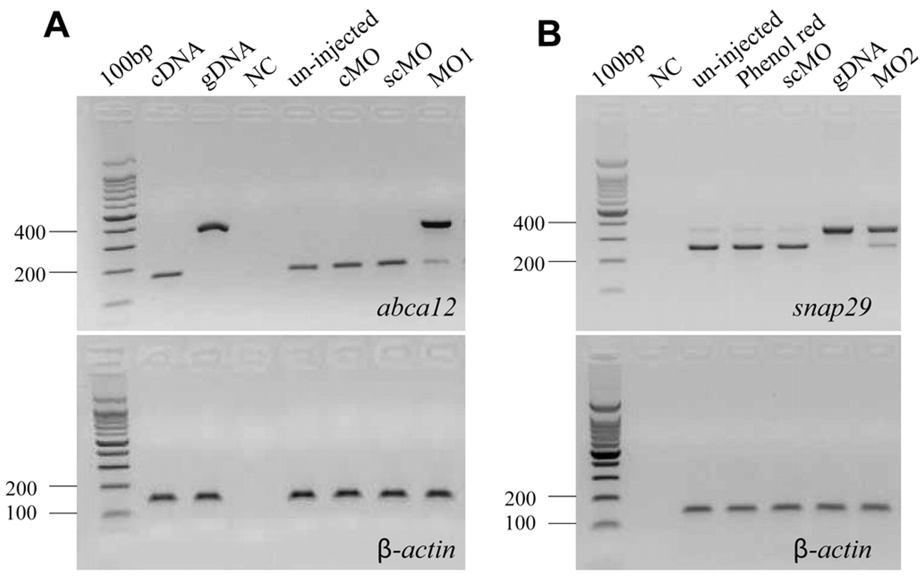 Fig. 3 Knockdown of abca12 and snap29 expression by morpholinos. (A) Knockdown of abca12. (B) Knockdown of snap29. MO1 and MO2 morpholinos (right lanes, the upper panel), which target the splice donor site at the exon-4–intron-4 border of the corresponding genes, prevents pre-mRNA splicing. The consequences of MO1 on abca12 pre-mRNA splicing and MO2 on snap29 mRNA splicing were determined by RT-PCR. The results showed the retention of intron 4 in the majority of mRNA transcripts (>90%) as compared with the normally transcribed control. The mRNA levels were normalized by the level of β-actin mRNA (lower panels). cDNA and gDNA represent amplification of the corresponding complementary DNA and genomic DNA, respectively. Injections with the 5-bp mismatched control morpholino for abca12 (cMO) or global standard control morpholino (scMO) did not alter pre-mRNA processing, similar to the uninjected controls or those injected with phenol red.