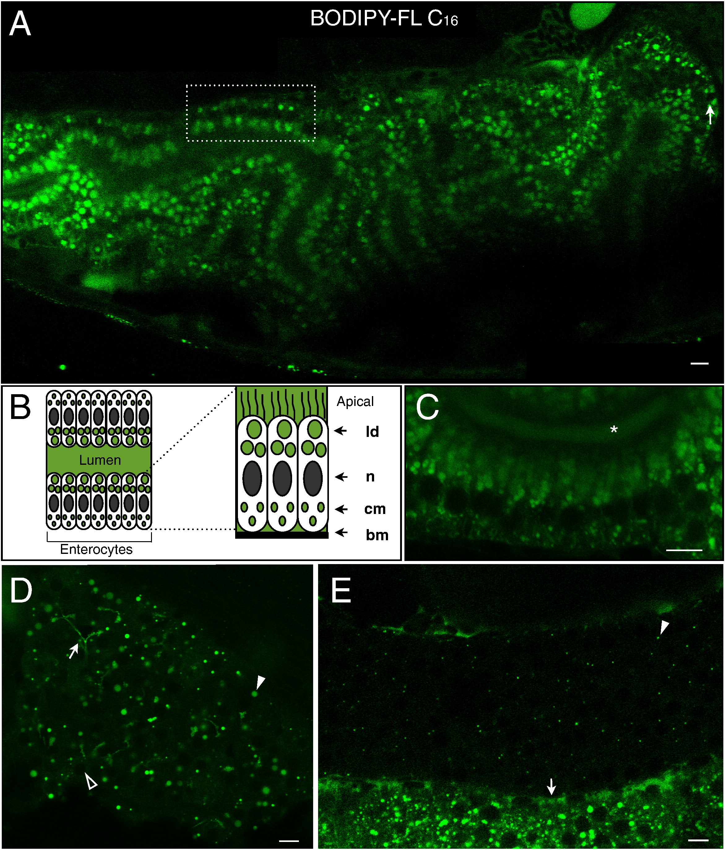 Fig. 1 BODIPY-FL C16 accumulates in lipid droplets in the digestive organs of live larval zebrafish. In all images, anterior is to the right to allow liver viewing. A. Enterocytes of the anterior intestinal bulb readily absorb BODIPY-FL C16 following an egg yolk and analog feed. The dotted box indicates a row of intestinal enterocytes exhibiting apical and basolateral accumulation of BODIPY-FL C16. Larger gaps in intestinal fluorescence (arrow) are likely non-absorbing enteroendocrine cells (Wallace et al., 2005). B. A schematic of lipid metabolism in polarized intestinal enterocytes. Enterocytes take up lipids from the intestinal lumen, form lipid droplets (ld) and secrete basolateral chylomicrons (cm). The basement membrane (bm) and cell nucleus (n) are also indicated. C. Intestinal enterocytes (dotted box indicates a single enterocyte) of larvae fed BODIPY-FL C16 display apical lipid droplets and smaller basolateral fluorescent foci reminiscent of chylomicrons. The intestinal lumen is indicated (asterisk). D. BODIPY-FL C16 accumulates within large hepatic lipid droplets (filled arrowhead) and faintly in hepatic ducts (arrow). Hepatocyte nuclei (empty arrowhead) are also visible. E. BODIPY-FL C16 accumulates throughout the exocrine pancreas, forming small fluorescent foci (arrowhead). Beneath the exocrine pancreas, an intestinal blood vessel (arrow) running the length of the intestine fluoresces, indicating analog entry into the vascular system. A is a composite of 3 separate confocal images. Scale bars = 10μm. (n = 3; 6 larvae per feed.)