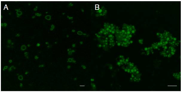 Fig. S1 Fluorescent liposomes are formed following addition of BODIPY-FL analogs to sonicated egg yolk. A. BODIPY-FL C16 partitions preferentially into liposomal membranes making liposomes appear as fluorescent rings when viewed using confocal microscopy. B. BODIPY-FL C5 partitions into the liposomal core, making liposomes appear as fluorescent circles. BODIPY-FL C12, C2, and the BODIPY alone also partition into the aqueous core of liposomes (data not shown). Scale bars are 5 μm.