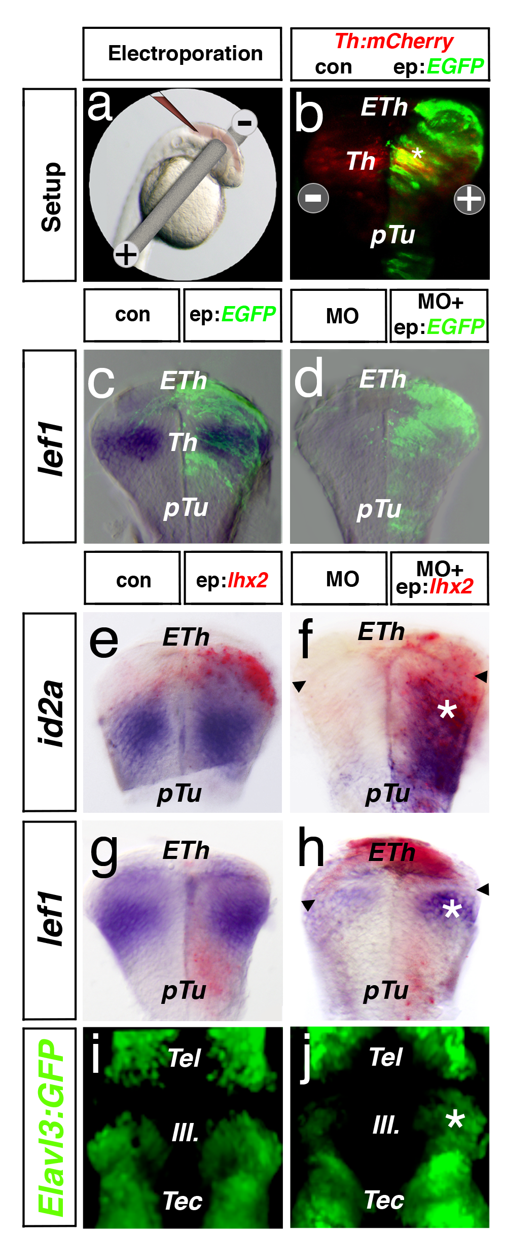 At 24 hpf, DNA (indicated in red) was injected into the brain ventricle followed by electroporation approach (a). To validate the specificity and efficiency, we targeted one hemisphere of the thalamus territory with EGFP DNA at 24 hpf. We find a co-localization with the thalamus-specific marker barhl2:mCherry at 48 hpf (b). Analysis of cross-sections reveal that electroporation of EGFP DNA does not alter the expression of lef1 in wt embryos (c). Furthermore, we find strong down-regulation of lef1 in lhx2/lhx9 morphant embryos, which is not altered by EGFP DNA electroporation (d). After electroporation of lhx2 DNA, we observe an unaltered expression of id2a, lef1, and Elavl3-GFP expression within the endogenous expression site in the electroporated hemispheres (e, g, i). Electroporated side was identified by an ISH against lhx2 mRNA in red. However, electroporation of lhx2 DNA at 24 hpf can restore the expression of id2a, lef1, and Elavl3-GFP in Lhx2/Lhx9-deficient embryos (f, g, j; asterisk). Notably, electroporation of Lhx2 can ectopically induce id2a expression in the basal plate—that is, in the pTu (f). pTu, posterior tuberculum; RP, roof plate, Tec, tectum; Tel, telencephalon.