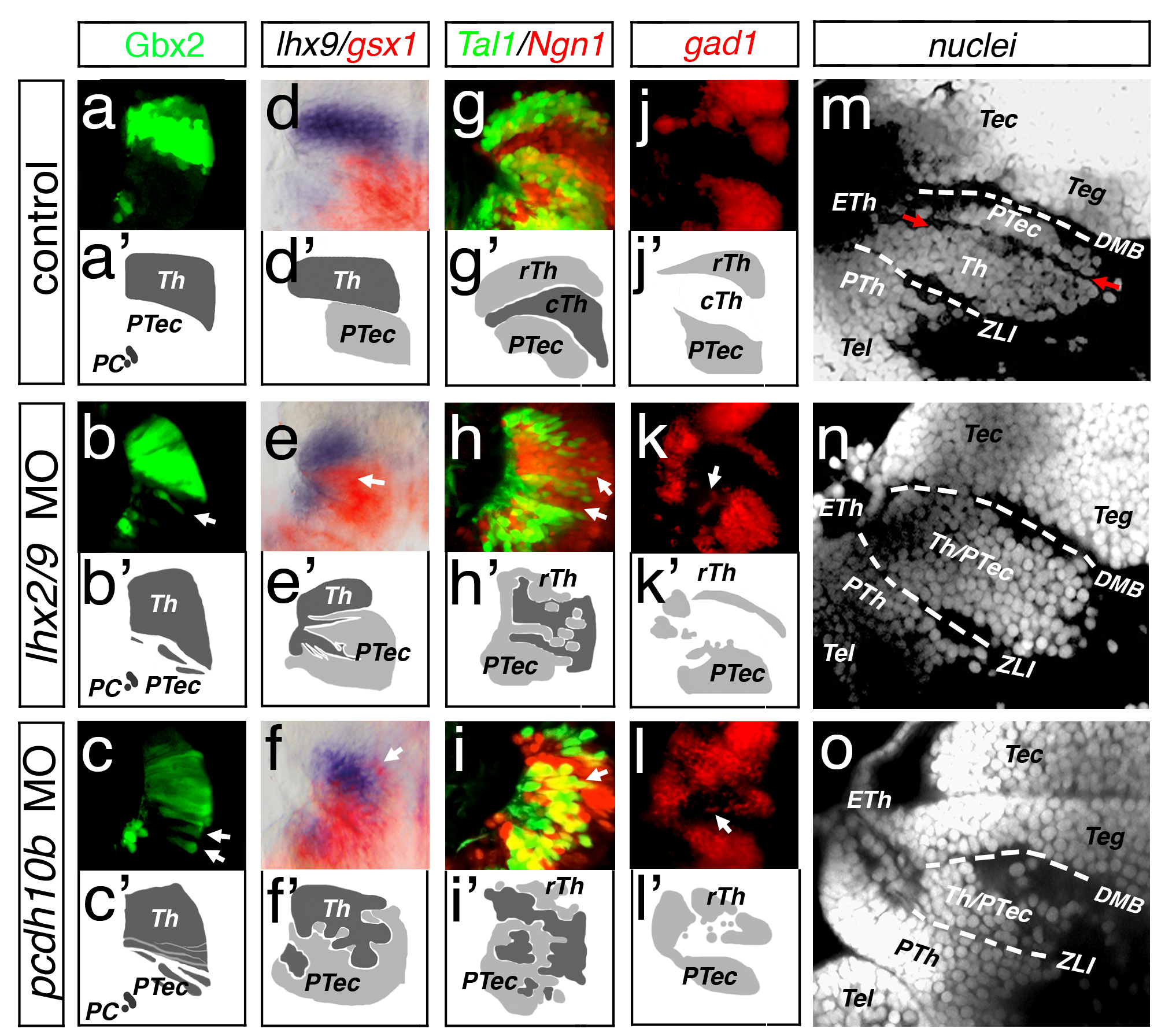 Dorsal views of the left hemisphere of embryo at 42 hpf (a–c), 48 hpf (d–i), and 3 dpf (j–l) are displayed. To visualize orientation of the figures, small sketches accompany the experiments showing the thalamus (Th) in dark grey and the rostral thalamus (rTh)/pretectum (PTec) in light grey. At 4 dpf, the anatomy of the caudal forebrain is visualized by a confocal microscopy analysis of ubiquitous nuclei staining by Sytox green (m–o). At 42 hpf, gbx2:GFP expression marks the thalamus as well as the position of the diencephalic-mesencephalic border (DMB) by the position of the posterior commissure (PC). Knock-down of Lhx2/Lhx9 leads to the appearance of gbx2:GFP positive cells posterior to endogenous expression domain (b, white arrow). In embryos knocked down for Pcdh10b, thalamic gbx2:GFP cells appear similarly to (b) in the pretectum (c, white arrows). Analysis of lhx2/lhx9 morphant embryos and pcdh10b morphant embryos by a double ISH approach for lhx9/gsx1 (d–f). lhx9 marks the thalamus and gsx1 the pretectum seen in a dorsal view (d). In Lhx2/Lhx9 morphant embryos, the expression pattern of lhx9 and gsx1 intermingles (e, white arrow) similar to the phenotype observed in pcdh10b morphant embryos (f; white arrows). Confocal sectioning of lhx2/lhx9 double morphant embryos in vivo reveals mixing between Tal1:GFP positive and the neurog1:RFP positive cells in the cTh (g–h2, white arrows). A similar intermingling phenotype is detectable in pcdh10b morphant embryos at 48 hpf (i, i2). At 3 dpf, the rTh is marked by gad1 by a fluorescent ISH (j, j2). After knock-down of Lhx2/Lhx9, gad1 positive cells can be found in the territory of the cTh (k, white arrows); furthermore, in Pcdh10b-deficient embryos, gad1 positive can also be found in the cTh (l, l2). Lateral views of the caudal forebrain show three cell nuclei loose border zones: the border between prethalamus and thalamus, the ZLI (white dashed lines), the one between the thalamus and the pretectum (red arrows), and the one between pretectum and midbrain DMB (white dashed lines). The border zone between the thalamus and the pretectum is not detectable in lhx2/lhx9 morphant embryos (n). Similarly, this demarcation is also missing in pcdh10b morphant embryos (o), whereas the ZLI and the DMB are not affected. Tec, tectum; Teg, tegmentum.