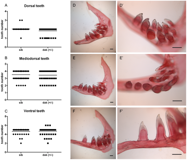 Adult dak heterozygote mutant has significantly less teeth in the dorsal row (A); whereas the number of teeth in the mediodorsal row (B) and ventral row (C) are similar to WT. Examples of pharyngeal teeth from adult ext2+/-: WT-like pharyngeal arch (D, D2), pharyngeal arch with a super-numeral tooth found in the ventral row (E, E2), and large gap between teeth (F, F2). D2, E2 and F2, larger views of D, E and F. Scale bars correspond to 0.1 mm.