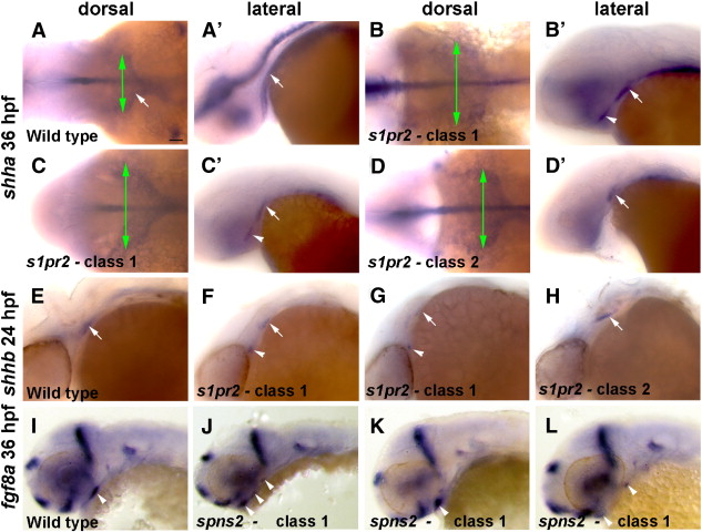 Variable disorganization of Shh-expressing endoderm and fgf8a ectodermal expression in s1pr2 and spns2b1110 mutants. (A–D) In situ hybridizations at 36 hpf show two classes of shha expression in s1pr2 mutants. When viewed dorsally Class 1 mutants have a wider shha endodermal expression domain (green arrows) than Class 2 mutants, and in lateral views of the same embryos Class 1 but not Class 2 mutants display ectopic shha expression (arrowheads) anterior to the normal expression domains (arrows). (E–H) In situ hybridizations at 24 hpf also show two classes of shhb expression in s1pr2 mutants, with Class I mutants (n = 3/8) showing ectopic anterior expression and Class 2 mutants (n = 5/8) displaying posterior truncation of the normal endodermal expression domain (arrows). (I–L) Several examples of spns2b1110 Class I mutants show fragmented expression of fgf8a expression in the oral ectoderm (arrowheads). Scale bar = 50 μm.
