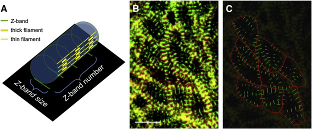Method for quantification of myofibril content. (A) Schematic depicts a three-dimensional model of a cylindrical myofibril (blue cylinder), with a two-dimensional projection of its Z-bands (black rectangle). Sarcomere organization is illustrated on the side of the cylindrical myofibril. The green rings represent Z-bands, which are equidistant and intersected with thin and thick filaments (yellow lines) perpendicularly. In our confocal images, we view a two-dimensional projection of this type of three-dimensional object, such that Z-bands appear as line segments (green lines on black rectangle). In the two-dimensional projection, the length of a myofibril is represented by the number of parallel Z-bands, and the thickness of a myofibril is represented by the size of each Z-band. (B, C) Localization of cortical actin and Z-bands in the ventricle at 48 hpf, visualized by phalloidin and α-actinin antibody staining (B), can be converted into measurable objects (C). Red polygons, tracing cell boundaries, are used to quantify cell surface area. Green line segments, tracing Z-bands, are used to quantify Z-band size. Scale bar is 10 μm. See Materials and methods and Fig. S1 for additional details regarding our imaging and measurement methods. Method for quantification of myofibril content. (A) Schematic depicts a three-dimensional model of a cylindrical myofibril (blue cylinder), with a two-dimensional projection of its Z-bands (black rectangle). Sarcomere organization is illustrated on the side of the cylindrical myofibril. The green rings represent Z-bands, which are equidistant and intersected with thin and thick filaments (yellow lines) perpendicularly. In our confocal images, we view a two-dimensional projection of this type of three-dimensional object, such that Z-bands appear as line segments (green lines on black rectangle). In the two-dimensional projection, the length of a myofibril is represented by the number of parallel Z-bands, and the thickness of a myofibril is represented by the size of each Z-band. (B, C) Localization of cortical actin and Z-bands in the ventricle at 48 hpf, visualized by phalloidin and α-actinin antibody staining (B), can be converted into measurable objects (C). Red polygons, tracing cell boundaries, are used to quantify cell surface area. Green line segments, tracing Z-bands, are used to quantify Z-band size. Scale bar is 10 μm. See Materials and methods and Fig. S1 for additional details regarding our imaging and measurement methods.