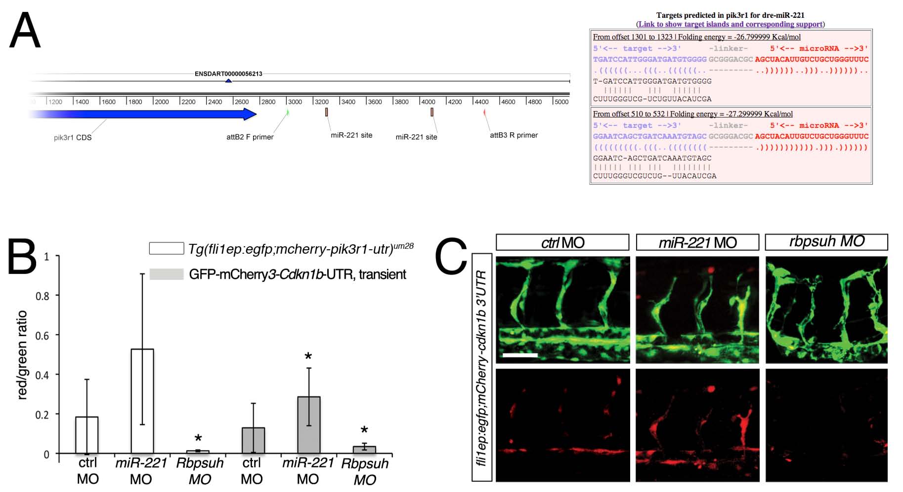 (B) Quantification of fluorescence in endothelial cell autonomous sensor assay. Red/green ratio indicates comparison of relative voxel intensities derived from 3-dimensional reconstructions of confocal micrographs of either stable Tg(fli1ep:egfp;mcherry-pik3r1-utr)um28 embryos or wild type embryos transiently co-injected with the cdkn1b endothelial sensor construct and Tol2 transposase mRNA. In both cases, embryos were injected with 10 ng control MO, 10 ng mir-221 MO, or 2.5 ng rbpsuh MO. * p<0.05; 7 to 13 embryos for each manipulation, obtained from 3 independent experiments.