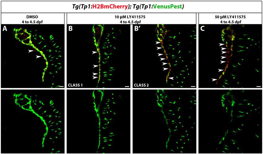 Analysis of Tg(Tp1:VenusPest) expression after a brief period of Notch signaling downregulation. Tg(Tp1:H2BmCherry); Tg(Tp1:VenusPest) larvae were treated with DMSO or LY411575 from 4 to 4.5 dpf. (A) In DMSO-treated larvae, the vast majority of pancreatic NRCs were Tg(Tp1:H2BmCherry)+ and Tg(Tp1:VenusPest)+. (B,B2) Larvae treated with 10 μM LY411575 showed variable donwregulation of Tg(Tp1:VenusPest) expression. (B) Seven out of 10 larvae (Class1) showed minor downregulation of Tg(Tp1:VenusPest) expression. In these larvae, only some Tg(Tp1:H2BmCherry)+ were Tg(Tp1:VenusPest)- (white arrowheads). (B2) Three out of 10 larvae (Class 2) exhibited significant downregulation of Tg(Tp1:VenusPest) expression and multiple Tg(Tp1:H2BmCherry)+ were Tg(Tp1:VenusPest)- compared with DMSO controls (white arrowheads). (C) Larvae treated with 50 μM LY411575 showed consistent downregulation of Tg(Tp1:VenusPest) expression compared with DMSO controls. In these larvae, many Tg(Tp1:H2BmCherry)+ cells were Tg(Tp1:VenusPest)- (white arrowheads). All images are lateral views, anterior towards the top, ventral towards the right; white arrowheads indicate the IPD. The NRCs ventral to the IPD are gut cells. Scale bars: 20 μm.