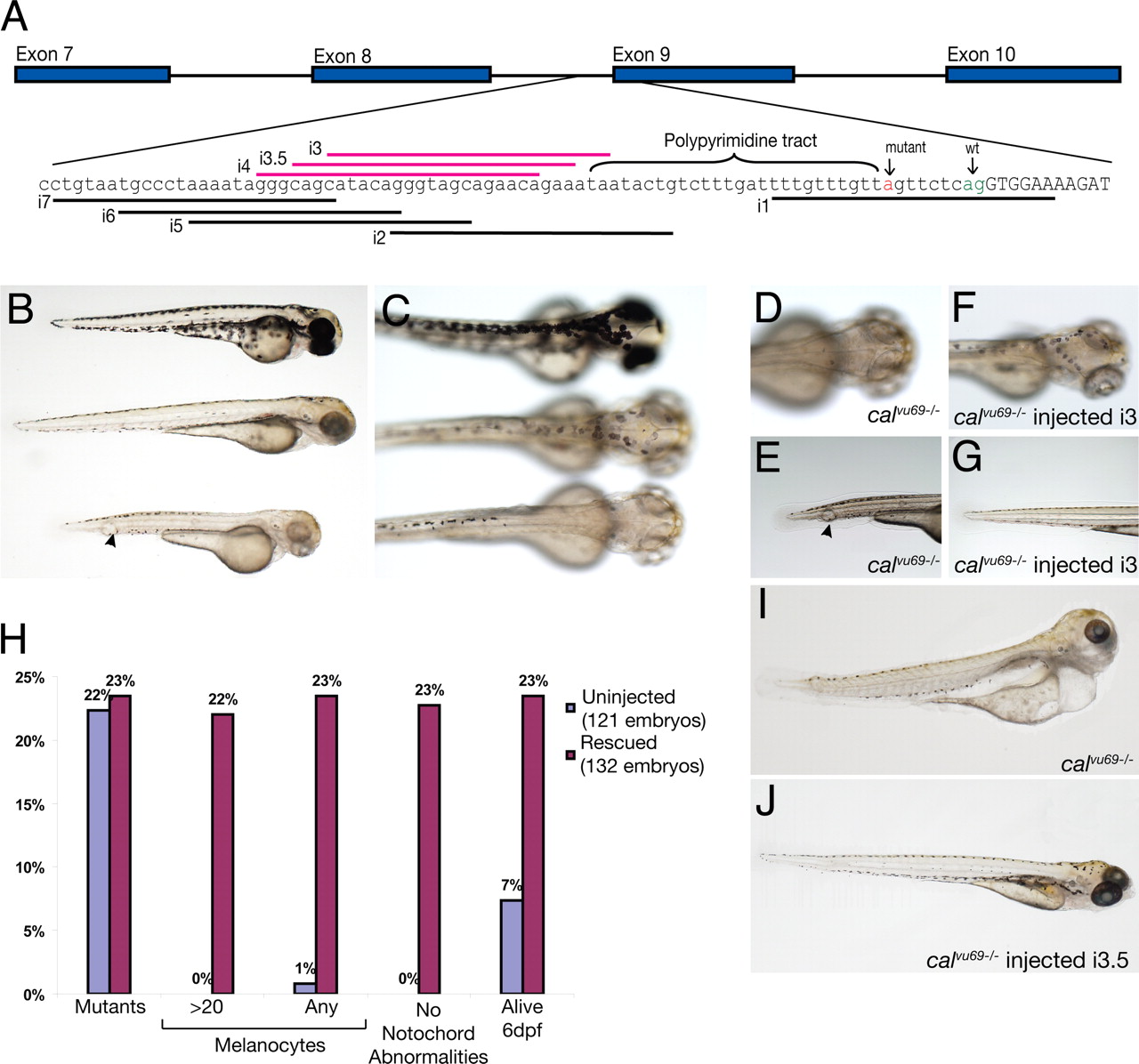 Morpholinos rescue the phenotype of calvu69 embryos. (A) Schematic and sequence information for the design of morpholinos directed toward the rescue of the mutant splicing in calvu69 . The WT exon is uppercase. The mutation is highlighted in red, and the WT splice acceptor is in green. Each morpholino-binding site is indicated by a line located 52 to the polypyrimidine tract. Morpholinos that cause phenotypic rescue are highlighted in pink. Morpholino i1 served as a control to demonstrate that blocking of proper splicing at this exon–exon boundary would result in the calamity phenotype (data not shown). (B and C) Side-by-side comparisons of zebrafish 48 h after fertilization. (Top) WT sibling from calvu69 intercross clutch. (Bottom) calvu69/vu69 -mutant embryo. (Middle) calvu69/vu69 embryo rescued by injection of morpholino i3. (D and E) Close-up view of calvu69/vu69 -uninjected embryo showing lack of melanin pigmentation over head region and notochord abnormalities (arrowhead). (F and G) Close-up view of morpholino i3-rescued calvu69/vu69 embryo showing restoration of melanin pigmentation and a notochord absent of defects. (H) Quantification of the extent of rescue. A single group of embryos derived from several clutches, half injected with rescuing morpholino (red bars; uninjected, blue bars), was scored for the presence of any or a significant number of melanocytes (>20) and the presence of notochord defects. The scale of the graph reflects the expected 25% ratio of homozygous mutants derived from the heterozygous intercross. (I and J) Six days after fertilization, embryos were either uninjected (I) or injected (J) with rescuing morpholino i3.5. Rescued embryos maintain near-normal body morphology, whereas unrescued embryos swell, possibly because of decreased extracellular matrix integrity due to the loss of lysyl oxidase activity.
