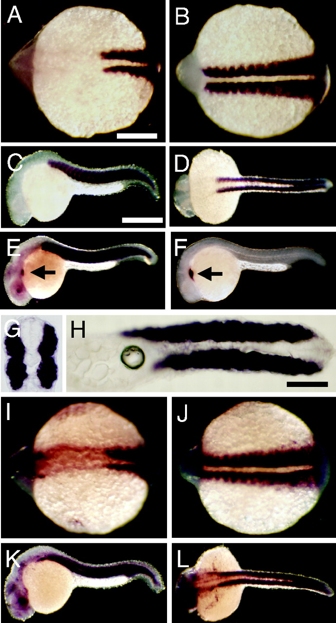 Temporal and spatial expression of Hsp90α1 and Hsp90α2 in zebrafish embryos. (A–D) Muscle-specific expression of Hsp90α1 in somites and skeletal muscles at 13 (A and B) and 24 hpf (C and D). (A and B) Dorsal view of anterior (A) and posterior (B) regions of a 13-hpf embryo. (C and D) Side (C) and dorsal (D) view of a 24-hpf embryo. The enzymatic reaction was carried out for 3 h during the whole-mount in situ hybridization. (E and F) Longer in situ staining (12 h) shows the cardiac expression of Hsp90α1 (arrow in E) in comparison with the cardiac muscle specific expression of myosin light chain (F). A weak staining of Hsp90α1 was also found in the brain and eye regions (E). (G and H) Cross (G) and horizontal (H) sections showing the muscle-specific expression of Hsp90α1 in zebrafish embryos at 24 hpf. (I–L) Expression of Hsp90α2 in somites, skeletal muscles and other tissues at 13 (I and J) and 24 hpf (K and L). In addition to muscle expression, Hsp90α2 expression was also detected in the head and eye regions (I). The enzymatic reaction was carried out for12 h during the whole-mount in situ hybridization. (Scale bars: A, 250 μm; C, 150 μm; and H, 50 μm.)