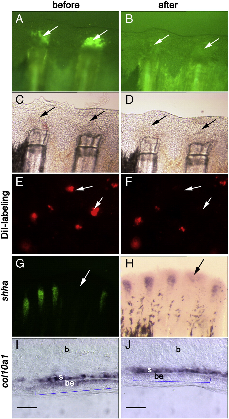 Controls for the method of laser cell ablation on fin regenerate. Pictures of fin rays were taken before (A, C and E) and immediately after (B, D and F) laser ablation of different cell types of the fin. (A) Shha:gfp-expressing cells in two rays of the 2.4shha:gfpABC#15 transgenic line at 2 dpa. (B) After laser ablation of the cells shown in (A), GFP fluorescence disappears. (C and D) Bright field images of the rays shown in (A and B), respectively, show no visible damage to the tissue following laser ablation. (E) A few epidermal cells of the fin regenerate were labeled by injection of DiI. (F) DiI fluorescence disappears following laser ablation of the targeted cells (arrows in E and F). (G) Fluorescent image of a fin regenerate following ablation of the GFP positive cells in one ray. (H) In situ hybridization immediately after laser ablation of the fin shown in (G) shows shha expression in each fin ray except in the ray on which ablation has been performed. (I and J) In situ hybridization on longitudinal sections of a fin ray with col10a1 probe. (I) Before ablation, col10a1 is expressed in the basal layer of the epidermis (where shha:gfp is also expressed) and in the adjacent scleroblasts. (J) Following ablation of the GFP positive epidermal cells, col10a1 expression in the basal epidermal cells disappears, while col10a1 expression in the scleroblasts remains unchanged. Arrows in (A–H), and the blue brackets in (I and J) indicate the cells targeted for laser ablation. Scale bar in panels I, J = 20 μm.