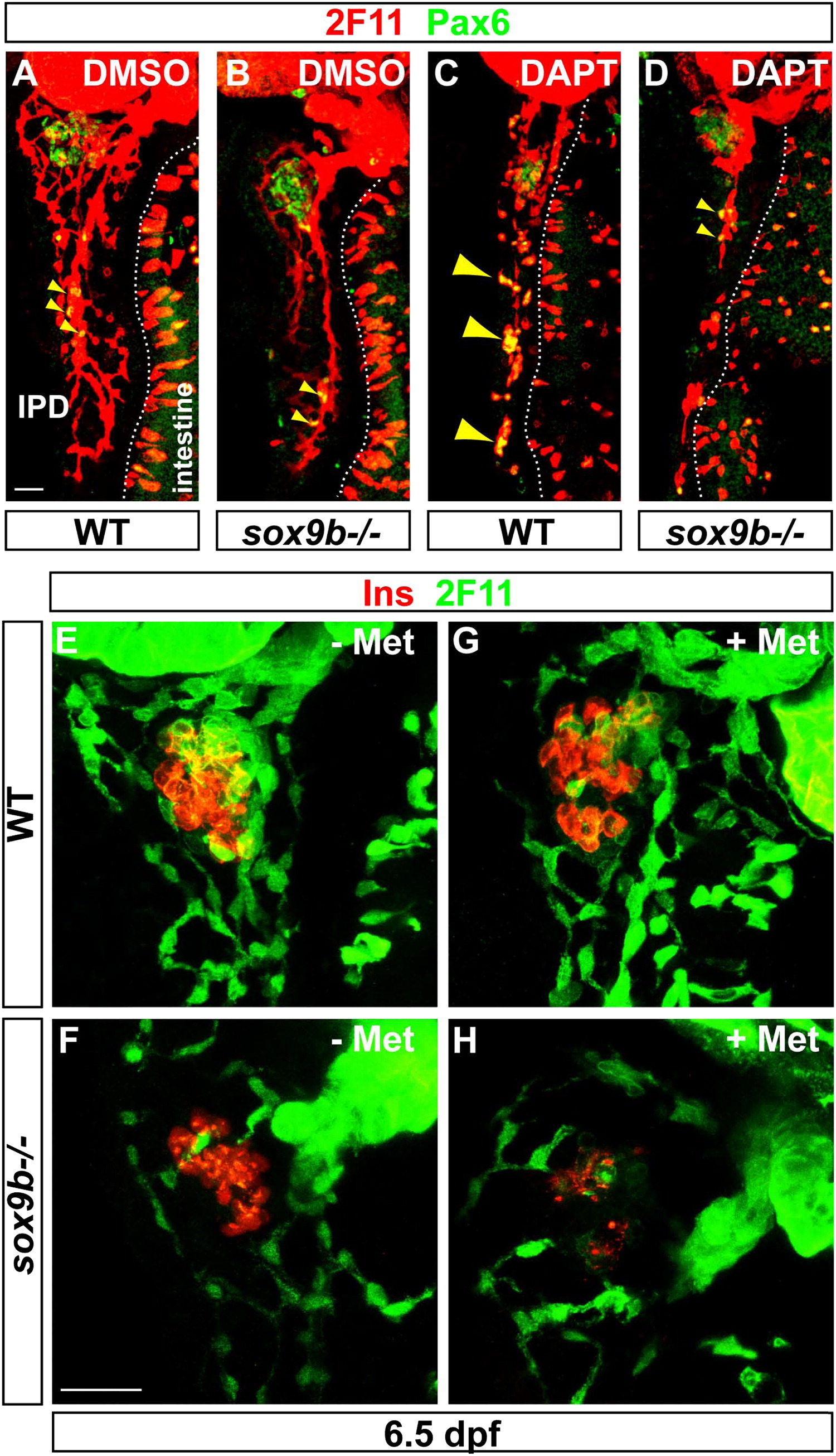sox9b is required for late endocrine cell formation in the IPD and for islet beta cell recovery upon ablation in larvae. (A–D) Immunodetection at 6 dpf of endocrine cell differentiation (Pax6) along the IPD labelled with 2F11 in wild type (A) and sox9b mutant larvae (B). Larvae were treated with DMSO (A, B) or DAPT (C, D) from 3 to 6 dpf. Secondary isolated endocrine cells are detected (small arrowheads) in wild type and sox9b mutant control larvae. The dotted line demarcates the intestine from the pancreatic region. (C, D) The massive increase in secondary islets resulting from DAPT treatment of wild type larvae (large arrowheads in C) is not observed in sox9b mutants which still display isolated endocrine cells along the IPD (small arrowheads in D). (E–H) Beta cell recovery in Tg(ins:nfsB-mCherry); sox9b larvae upon Metronidazole (Met) mediated ablation. Pancreatic ducts were labelled with 2F11 and beta cells were revealed by Insulin (Ins) immunodetection as mCherry fluorescence was undetectable after the process of immunofluorescence. (E, F) 6.5 dpf Tg(ins:nfsB-mCherry) wild type (E) and sox9b mutant larvae (F) 3 days (80 h) after DMSO treatment from 56 to 80 hpf. (G, H). Tg(ins:nfsB-mCherry) wild type (G) and sox9b mutant (H) larvae 3 days after Met exposure. Scale bar=20 μm.