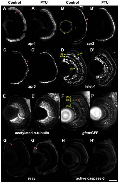 Immunostaining was conducted on 10-μm-thick cryosections of PTU-treated and control larvae at 4 dpf with the following first antibodies: (A & A′) anti-zpr1 for cones (red arrowhead), (B & B′) anti-zpr2 for RPE (red arrowhead), (C & C′) anti-zpr3 for rods (red arrowhead), (D & D′) anti-Islet1 for GCs, ACs, BCs and HCs, (E & E′) anti-acetylated α-tubulin for the axons of differentiated neurons, (G & G′) anti-PH3 for mitotic cells (red arrowheads) and (H & H′) anti-active caspase3 for apoptotic cells. (F & F′) MCs were visualized by cryosectioning of a transgenic fish Tg(gfap:GFP)mi2001 treated with PTU in the same manner. The cell bodies were visualized by green fluorescence (red arrowhead). All positive signal areas or cell counts were extracted and normalized by retinal area, which was traced in the channel with DAPI nuclei stain. There are no differences in staining of any markers between the PTU-treated and control groups except for zpr2, in which the positive signal/ retinal area was larger in the PTU-treated group. All images are transverse sections; the lens is on the left (the location is indicated by a dotted yellow circle in (B)) and dorsal is up. The approximate retinal cell layers and cell types are indicated in (D) and (F). Scale bar = 50 μm.