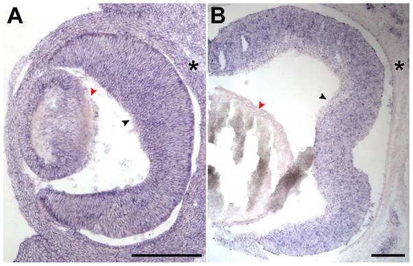In situ hybridization was conducted with a riboprobe specific for Tpo on 20-μm-thick cryosections obtained from mouse embryos at E13.5 (A; transverse section) and P0 (B; coronal section). (A) At E13.5, there was a general expression of Tpo in the whole embryo. (B) By P0, there was a specific expression of Tpo in the retina (black arrowhead) compared with lens (red arrowhead) and the surrounding periocular tissue (asterisks). Scale bar = 200μm for both (A) and (B).
